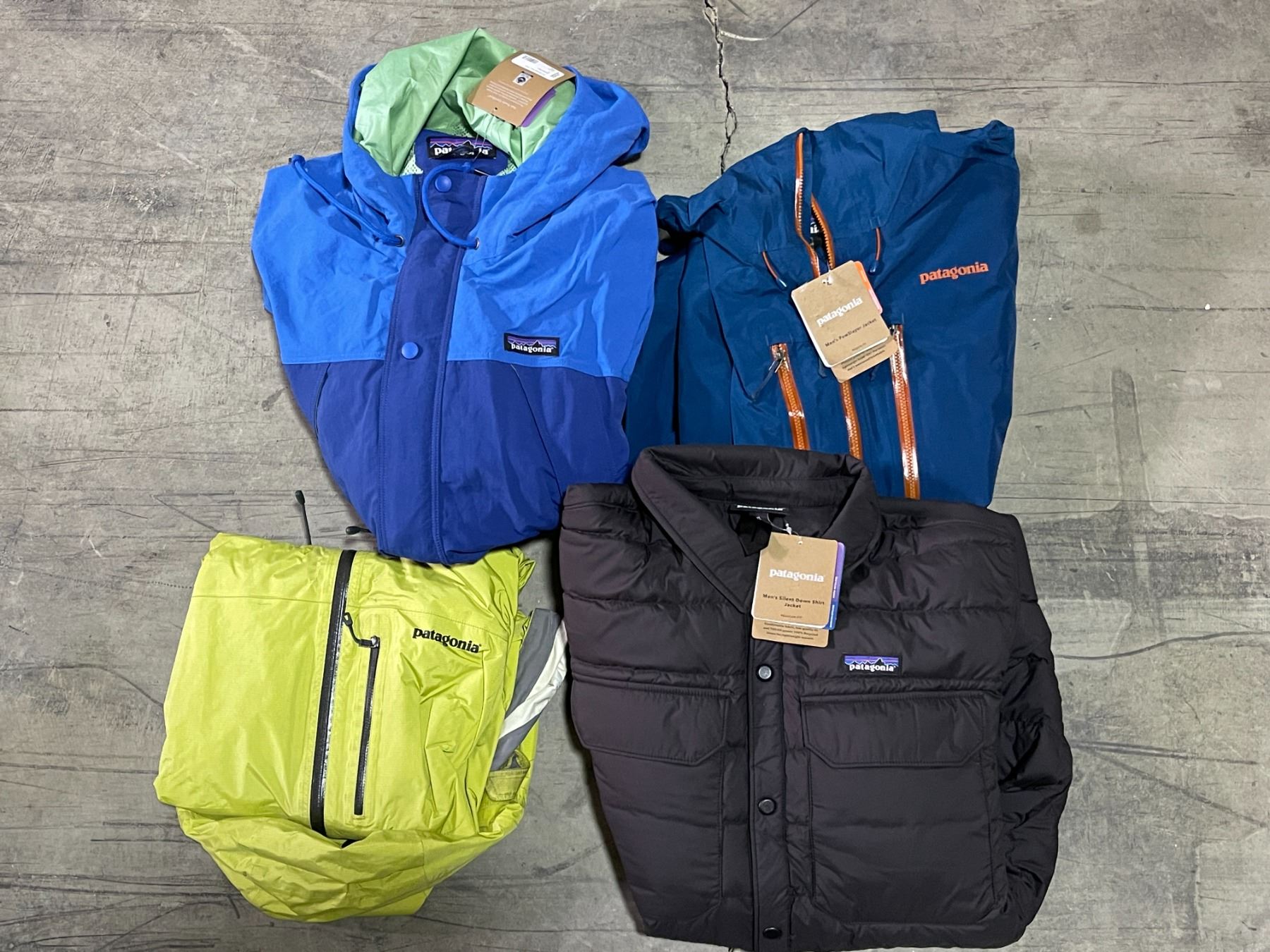 Group lot - x4 Patagonia Jackets - Approx Value : $770- Blue/Copper (L) Mens w/tags - Green (L) Mens - Blue (XS) Mens w/tags - Black (XL) Mens w/tags