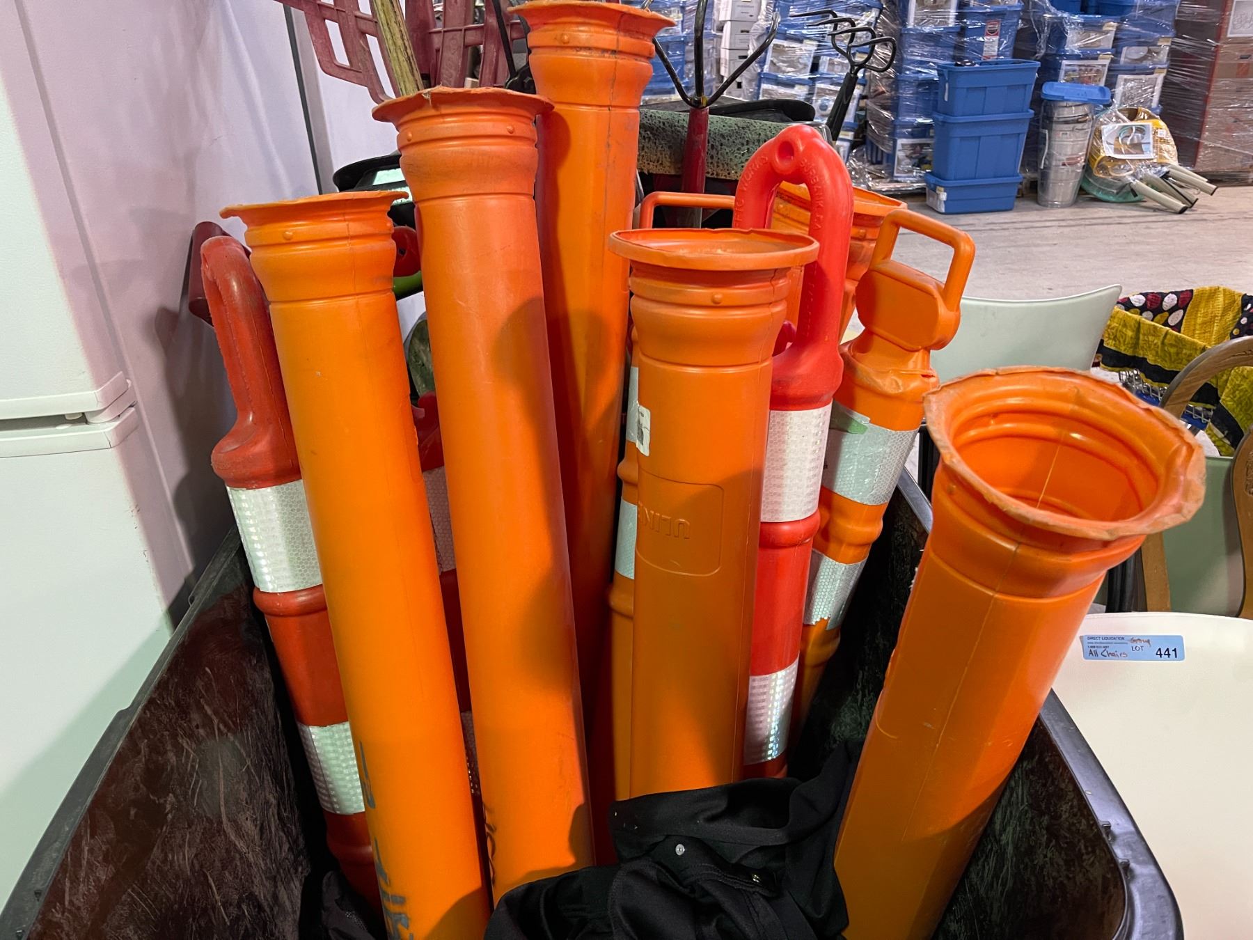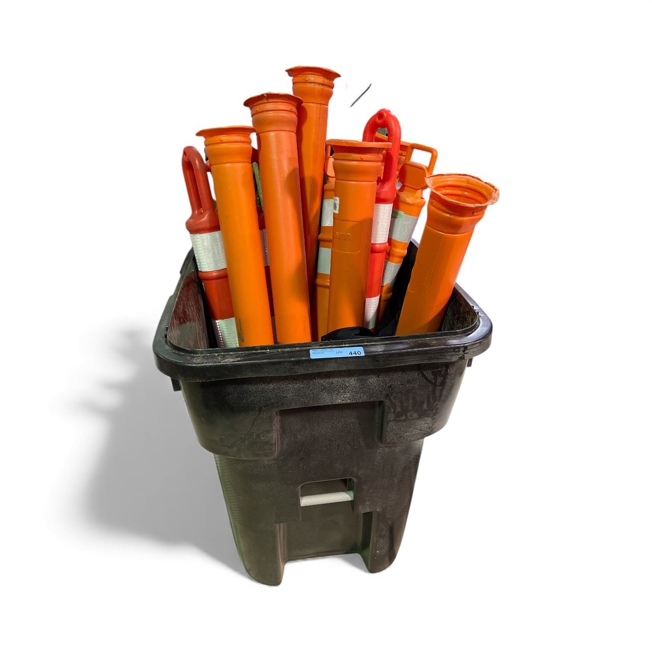 Group of 2 Wheeled Garbage Cans w/ Misc. Tools & approx. 12 Traffic Grab Delineator Posts