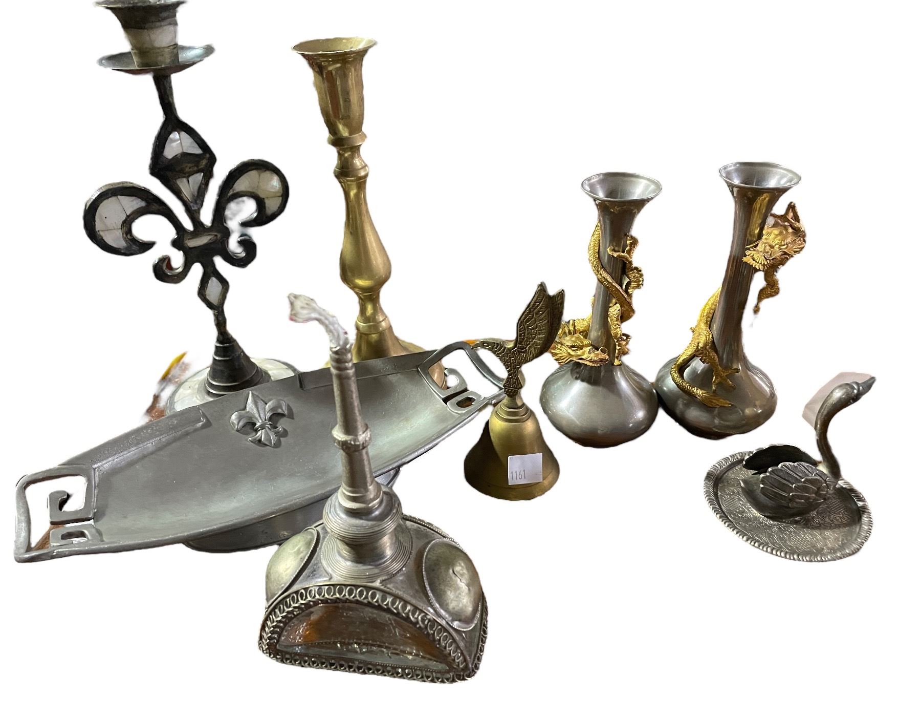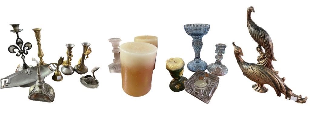 Group of Candle Holders, Candles, Bell, Peacock Figurines and more