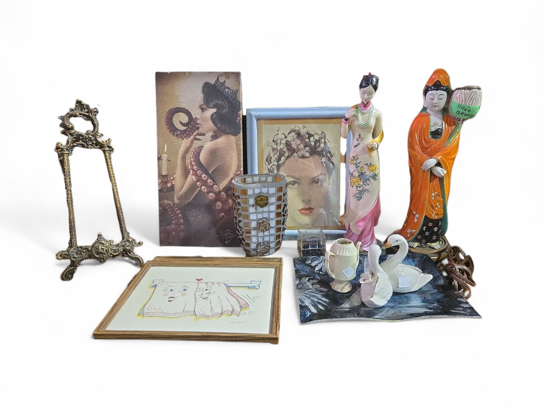 Group of Framed Alain Boisjoly Cartoons, Figurines, Lamp (small damage), Glass Tray and more