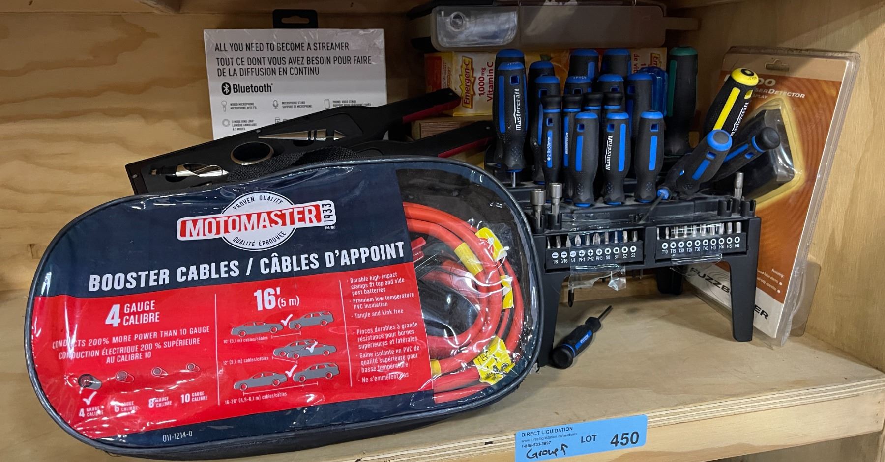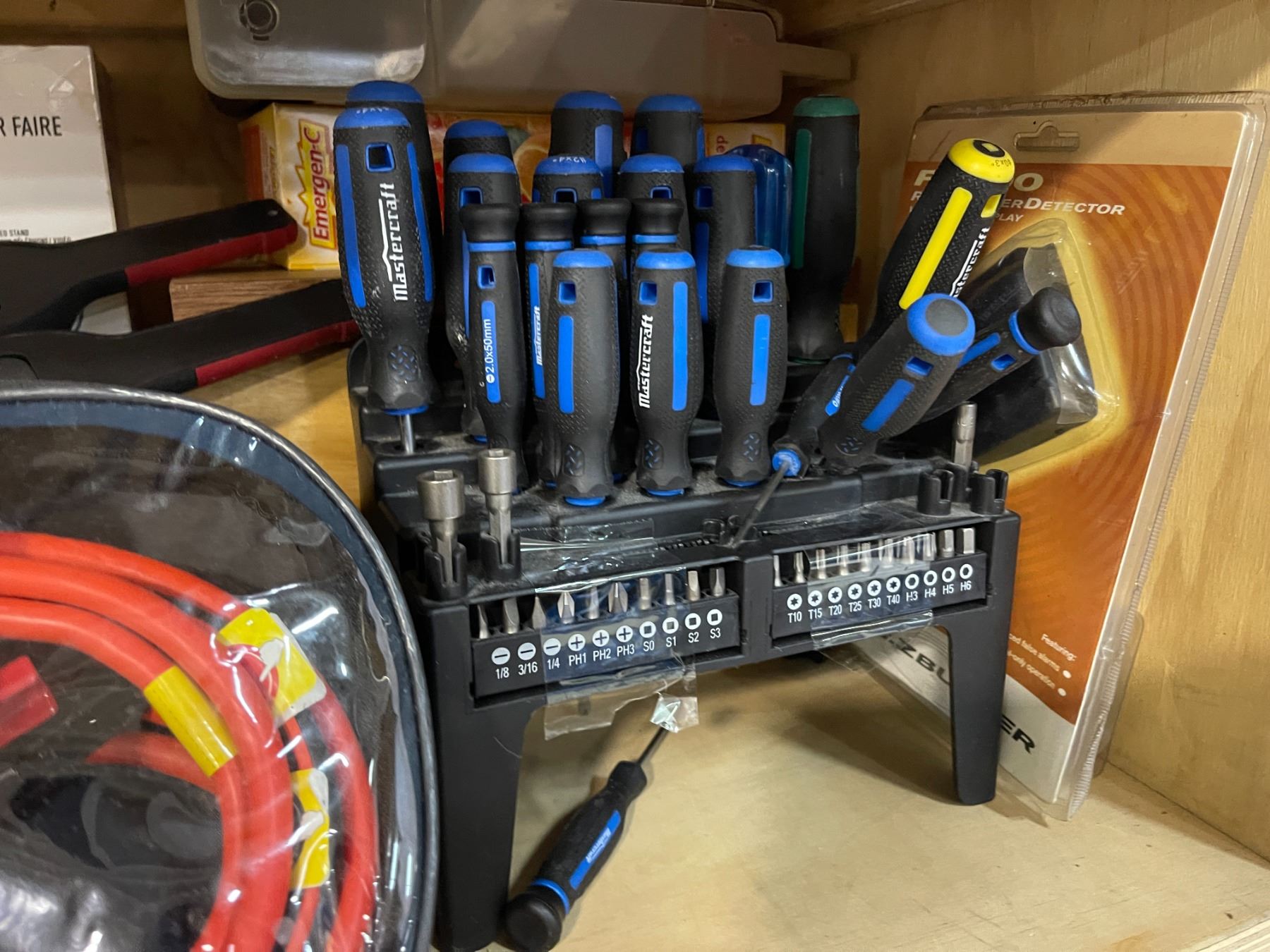 Group of Tools & Supplies Lot - includes Car Booster Cables, Mastercraft 4V USB-C Cutter, Hanmatek 3.6V Cordless Screwdriver, Mastercraft Screwdriver Stand Set & More