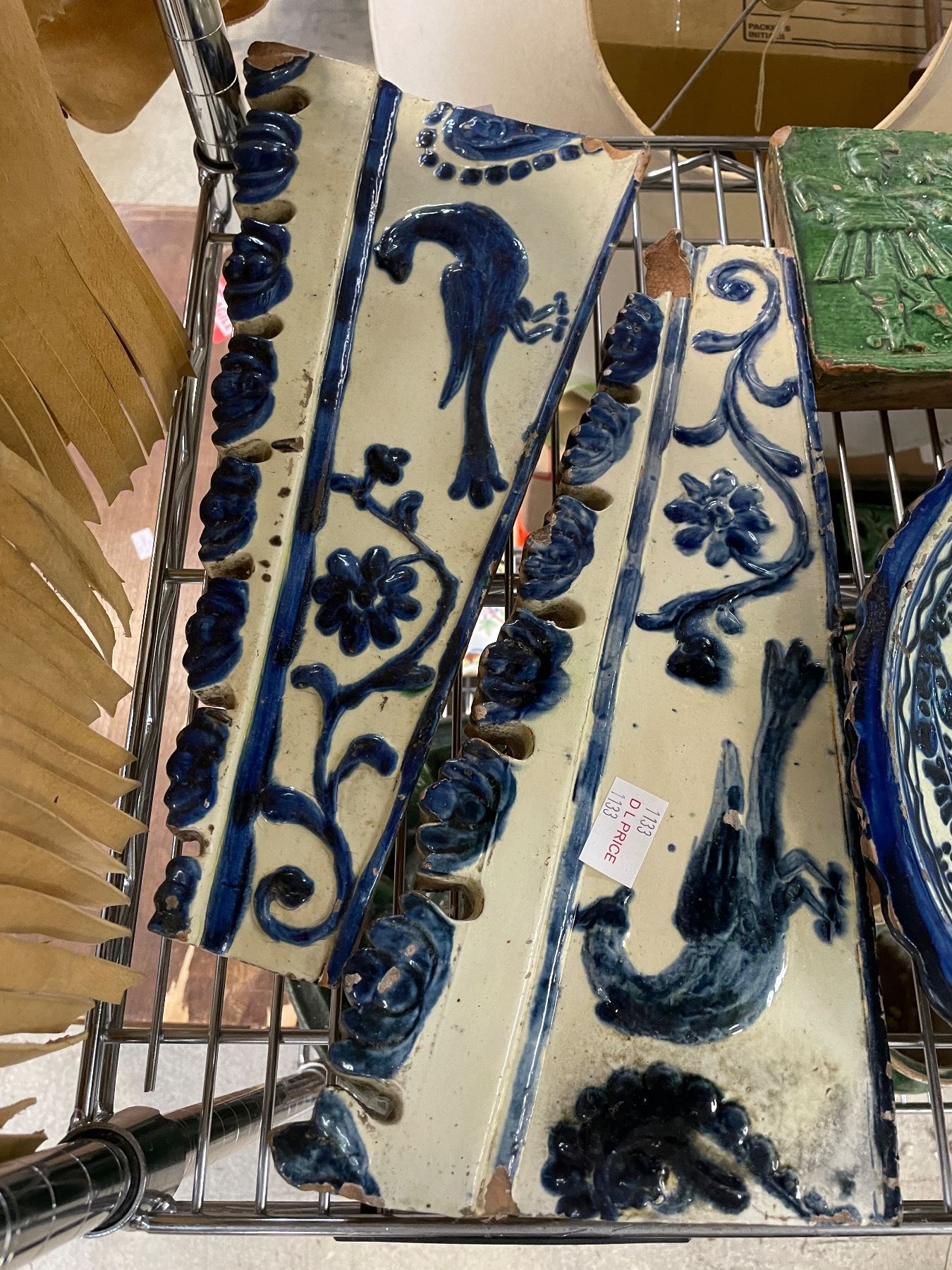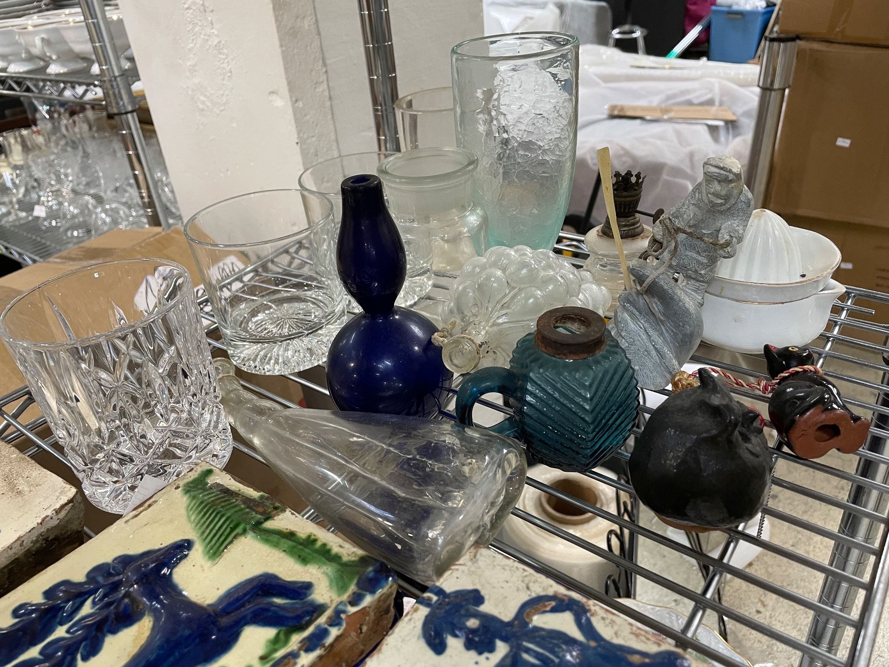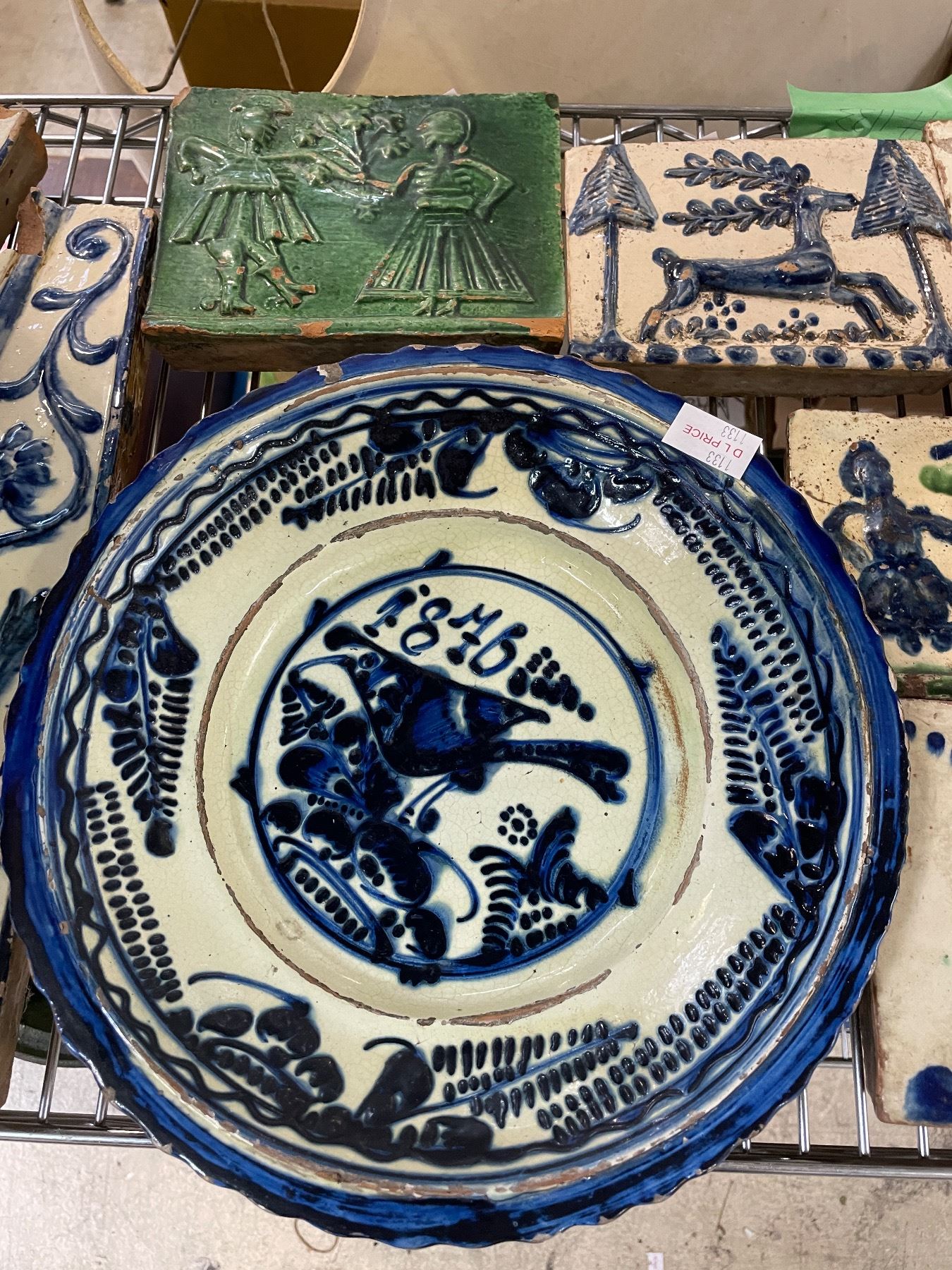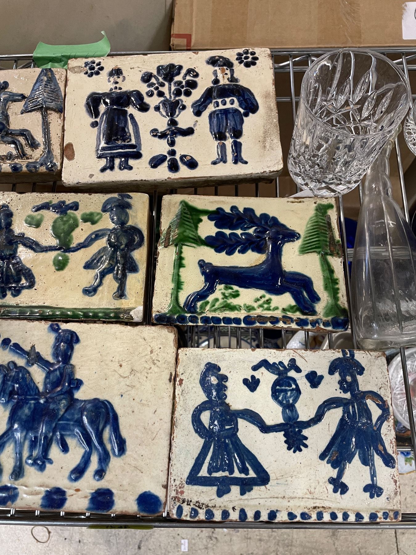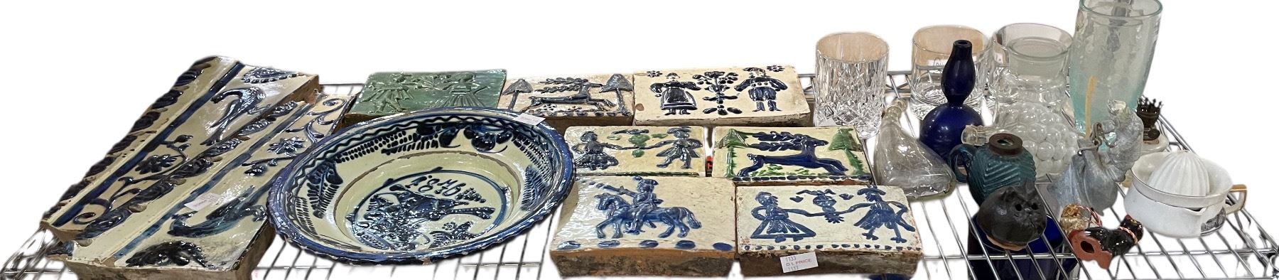 Group of Vintage Folk Art Ceramic Tiles, Pottery, and Assorted Glassware Decor