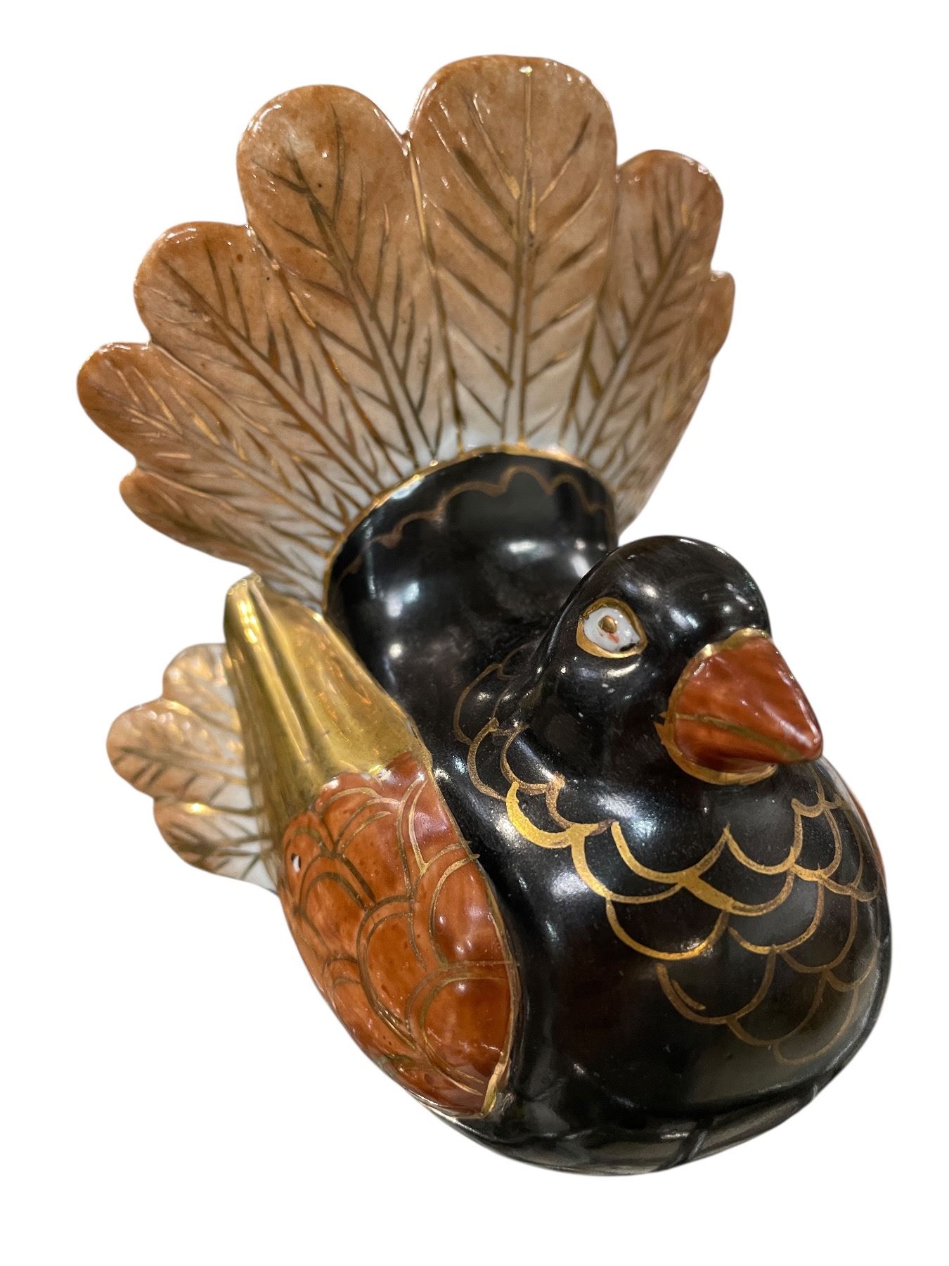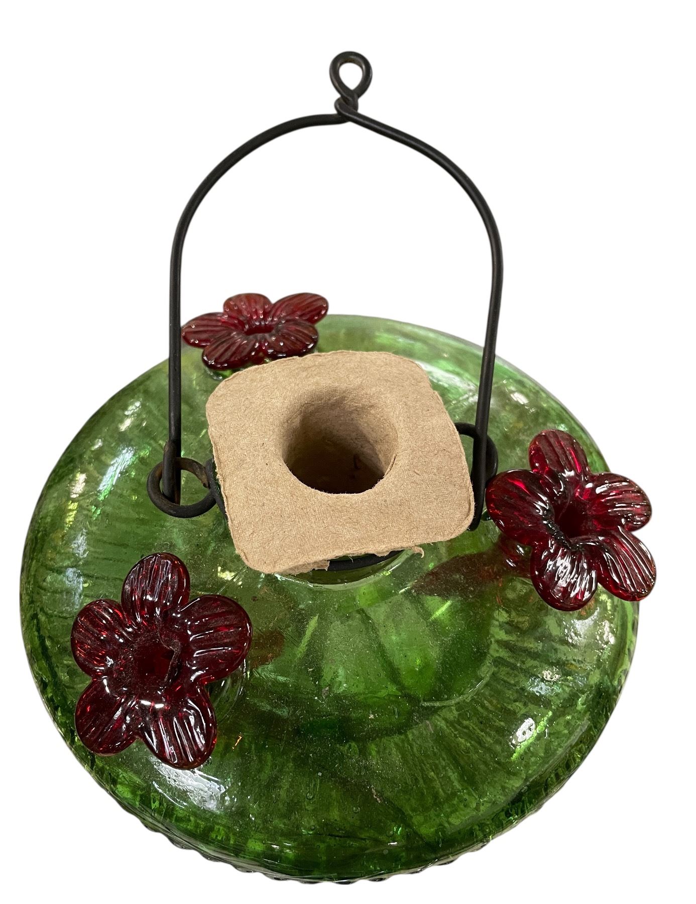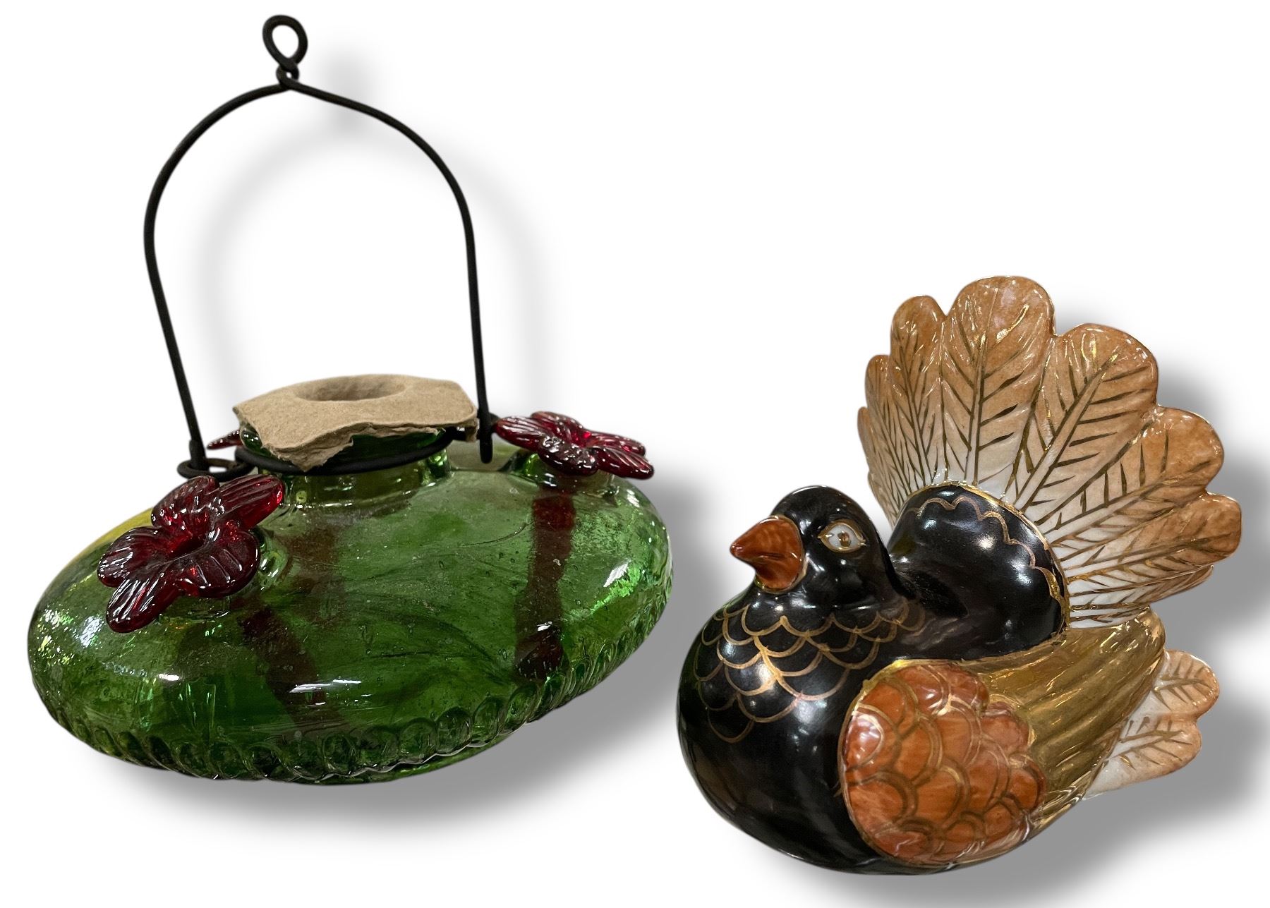 Handcrafted Green Glass Hummingbird Feeder & Ceramic Turkey Figurine Decor