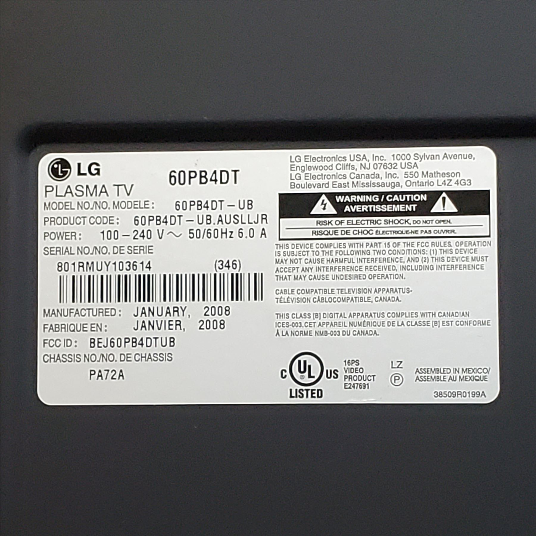 Huge LG Plasma 60" TV - Model 60P84DT-UB (w/ Cables, Tested Working Condition)