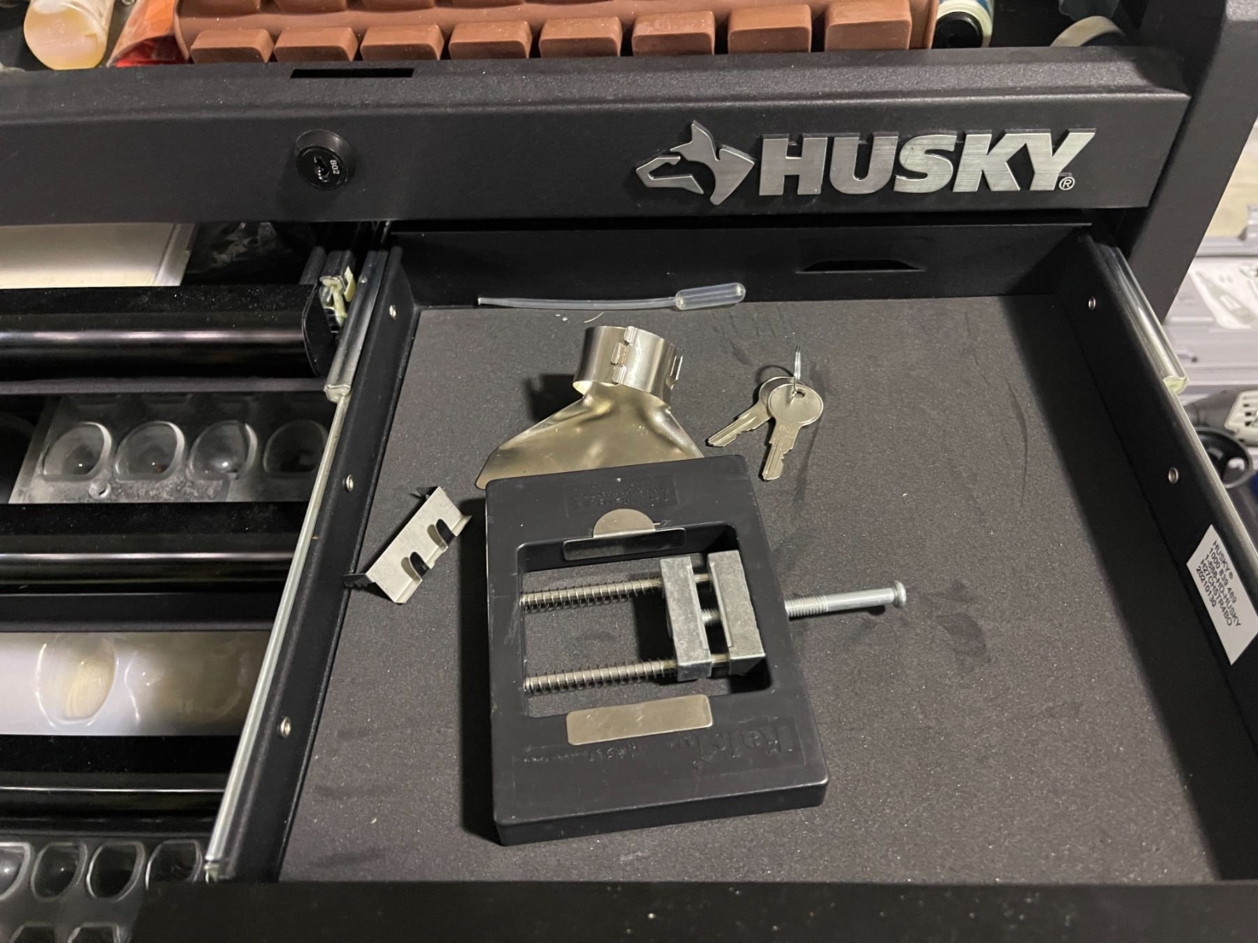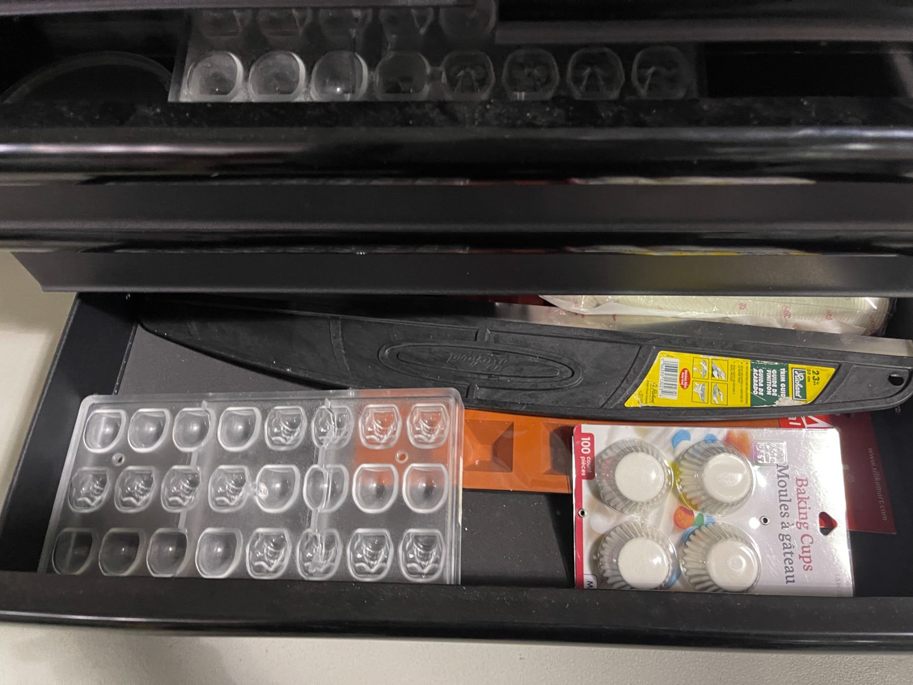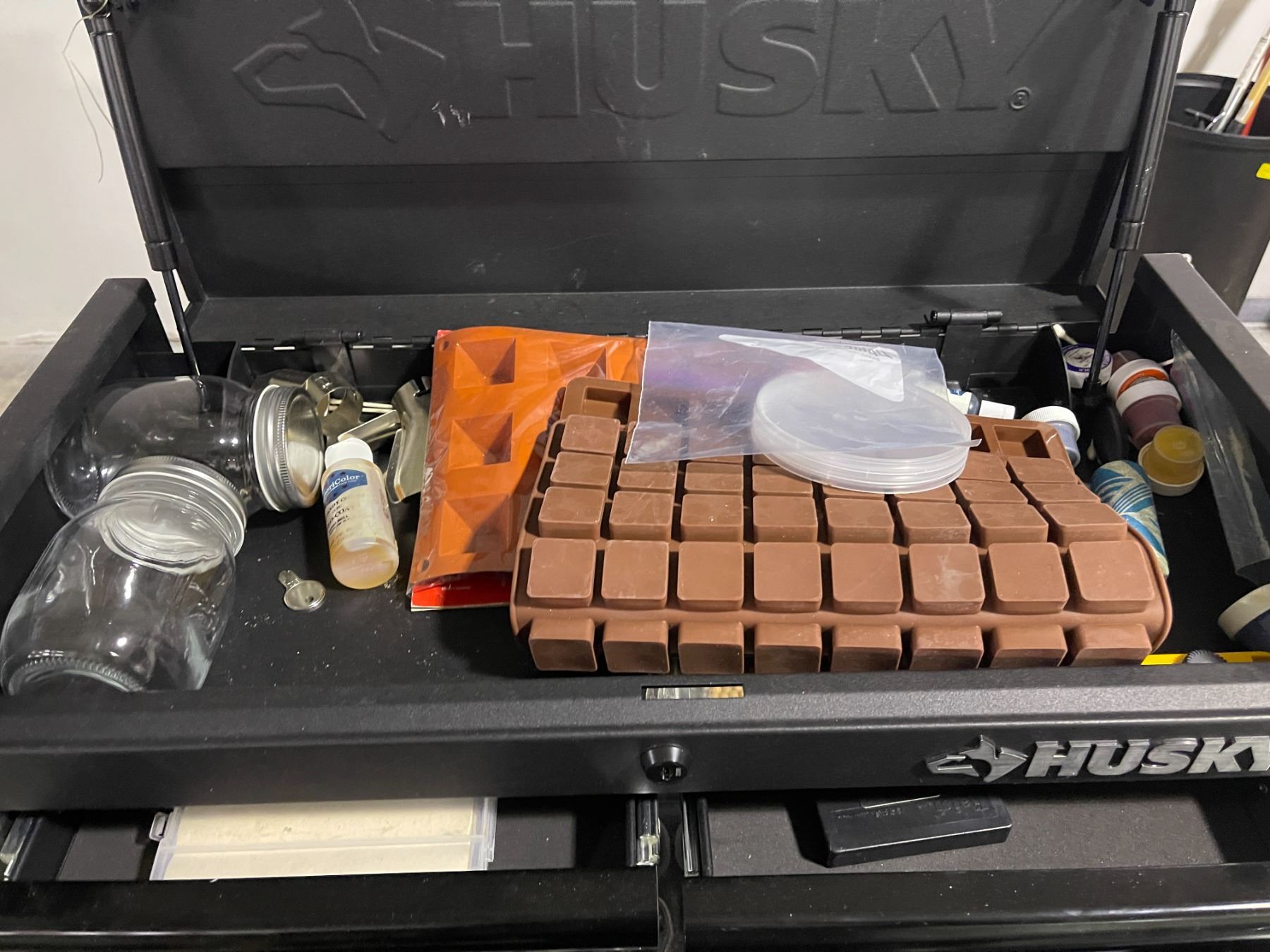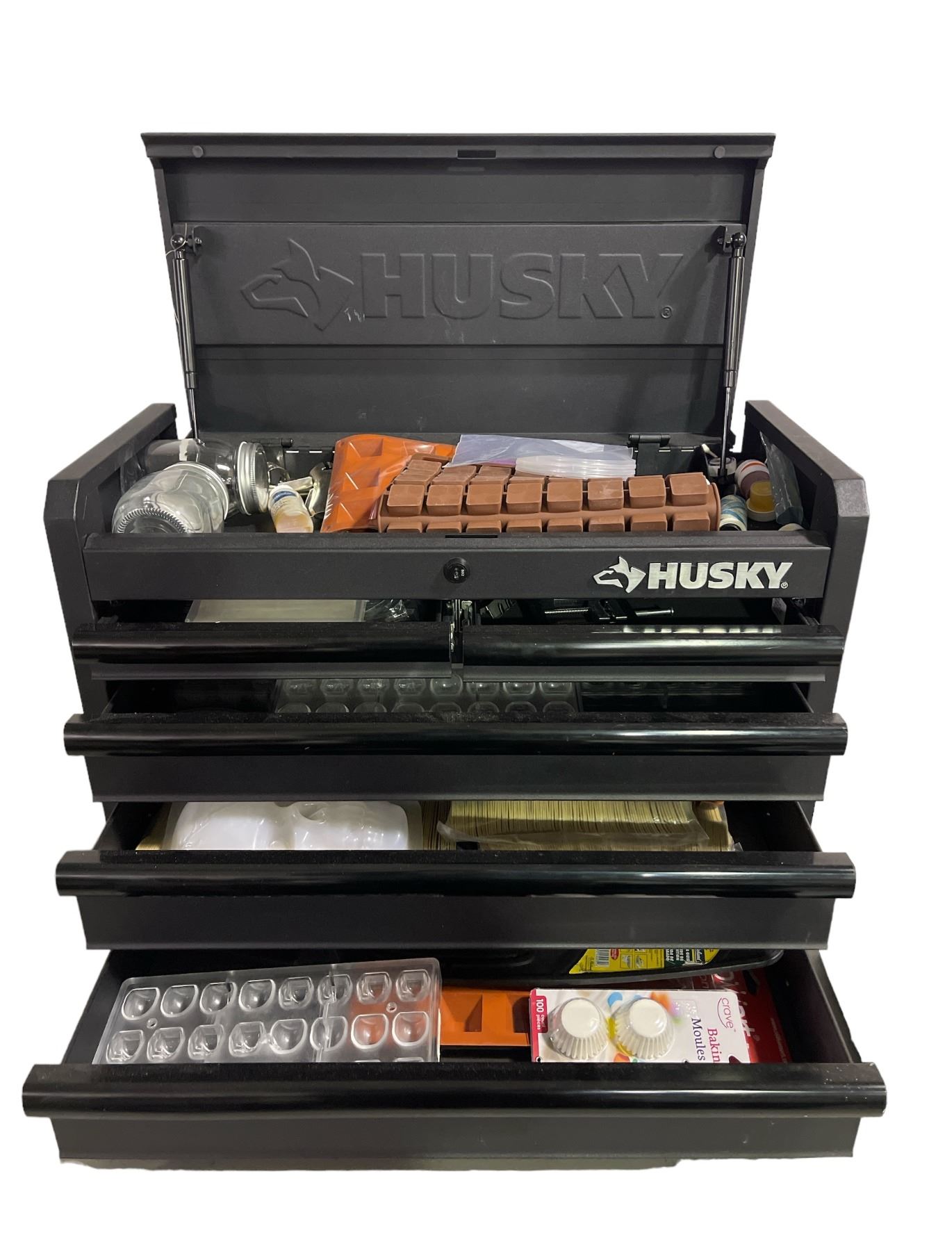 Husky 5 drawer toolbox filled with baking molds & misc baking supplies