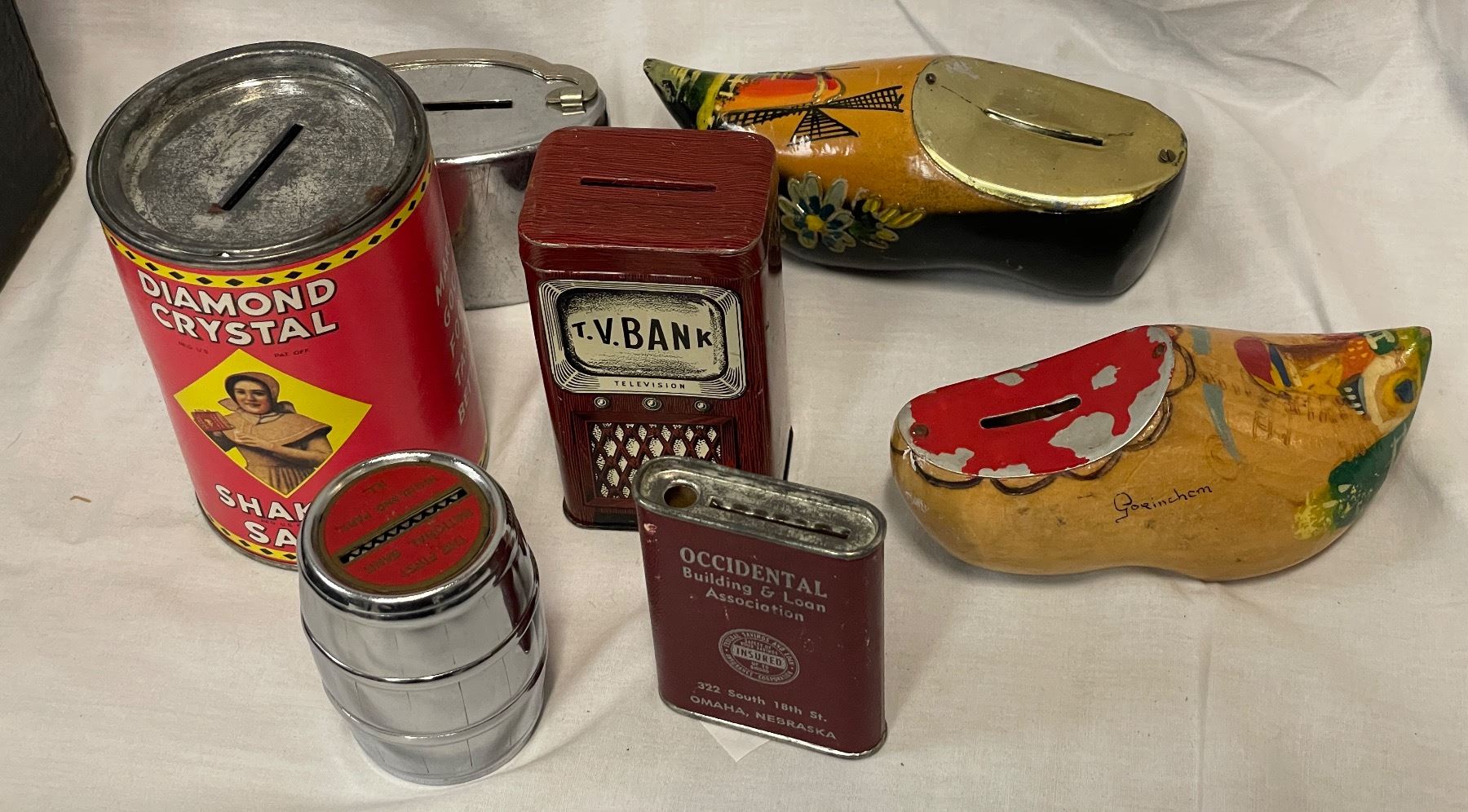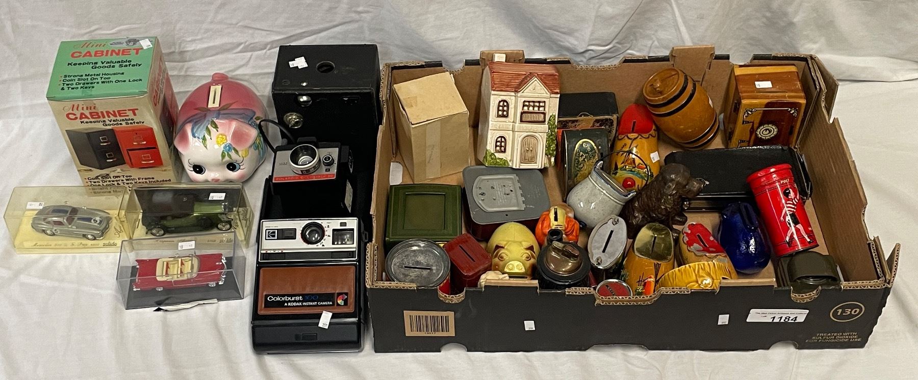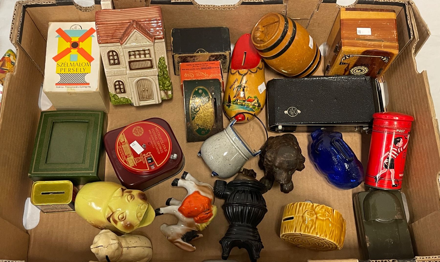 Large Assortment Of Collectibles, Ceramic Piggy Bank, Metal Pig Bank, Metal Dog And Cat Bank, Camera