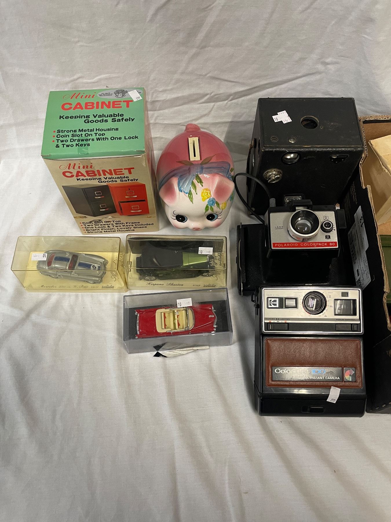 Large Assortment Of Collectibles, Ceramic Piggy Bank, Metal Pig Bank, Metal Dog And Cat Bank, Cameras, Stove Lighter, Etc..