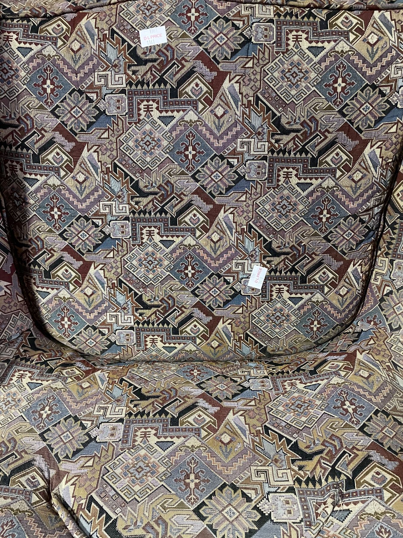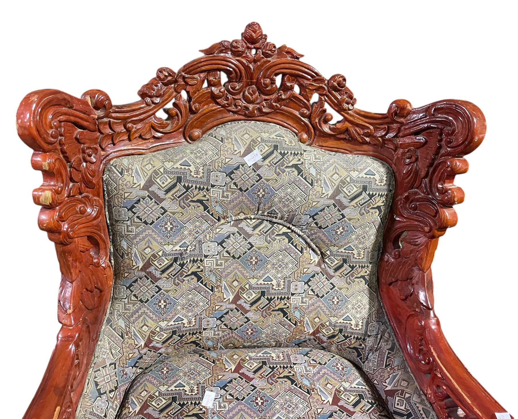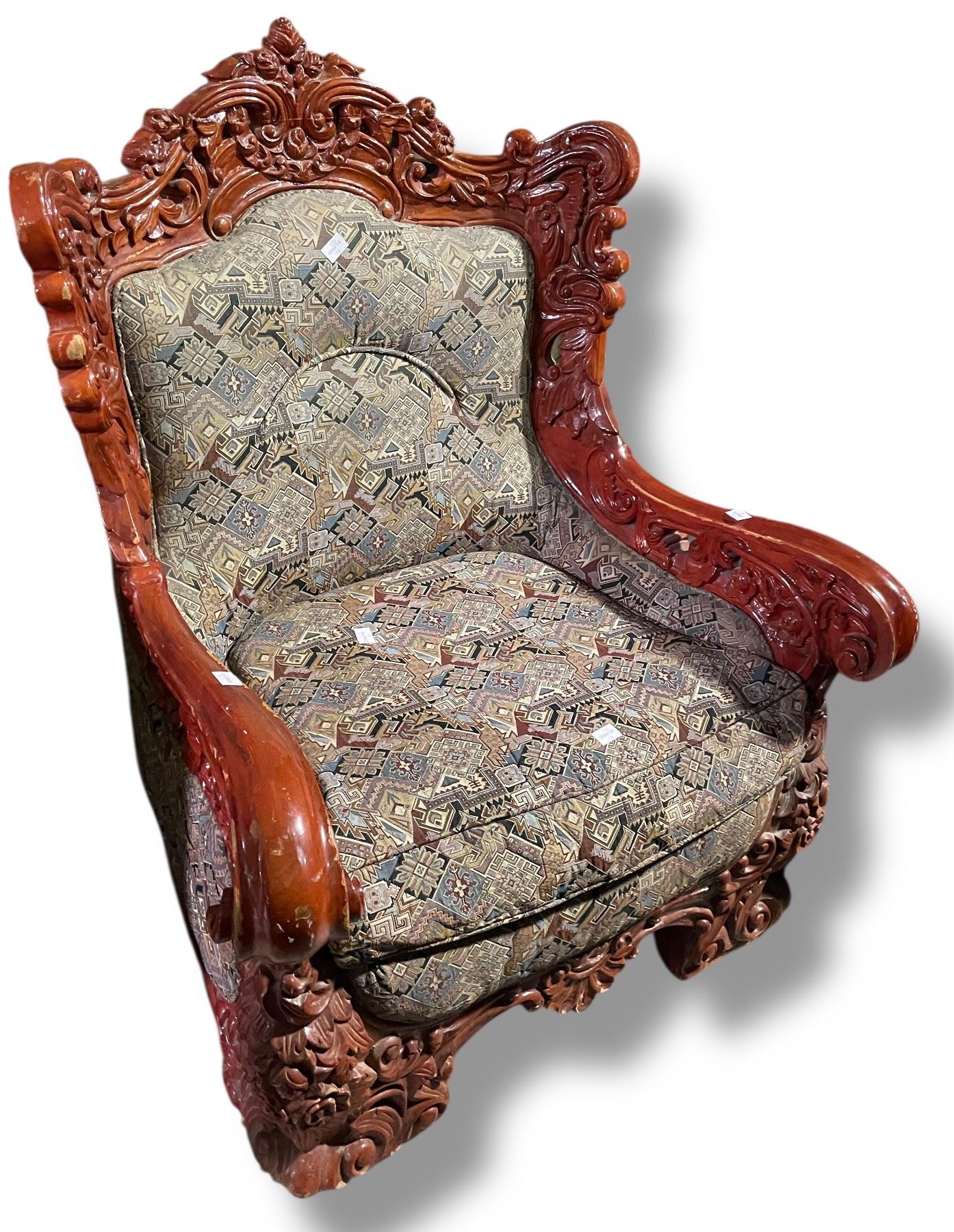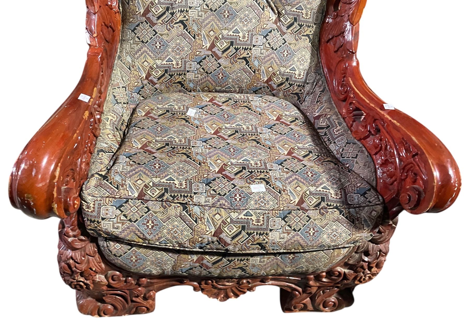 Large Carved Wood Frame Arm Chair with Brocade Upholstery