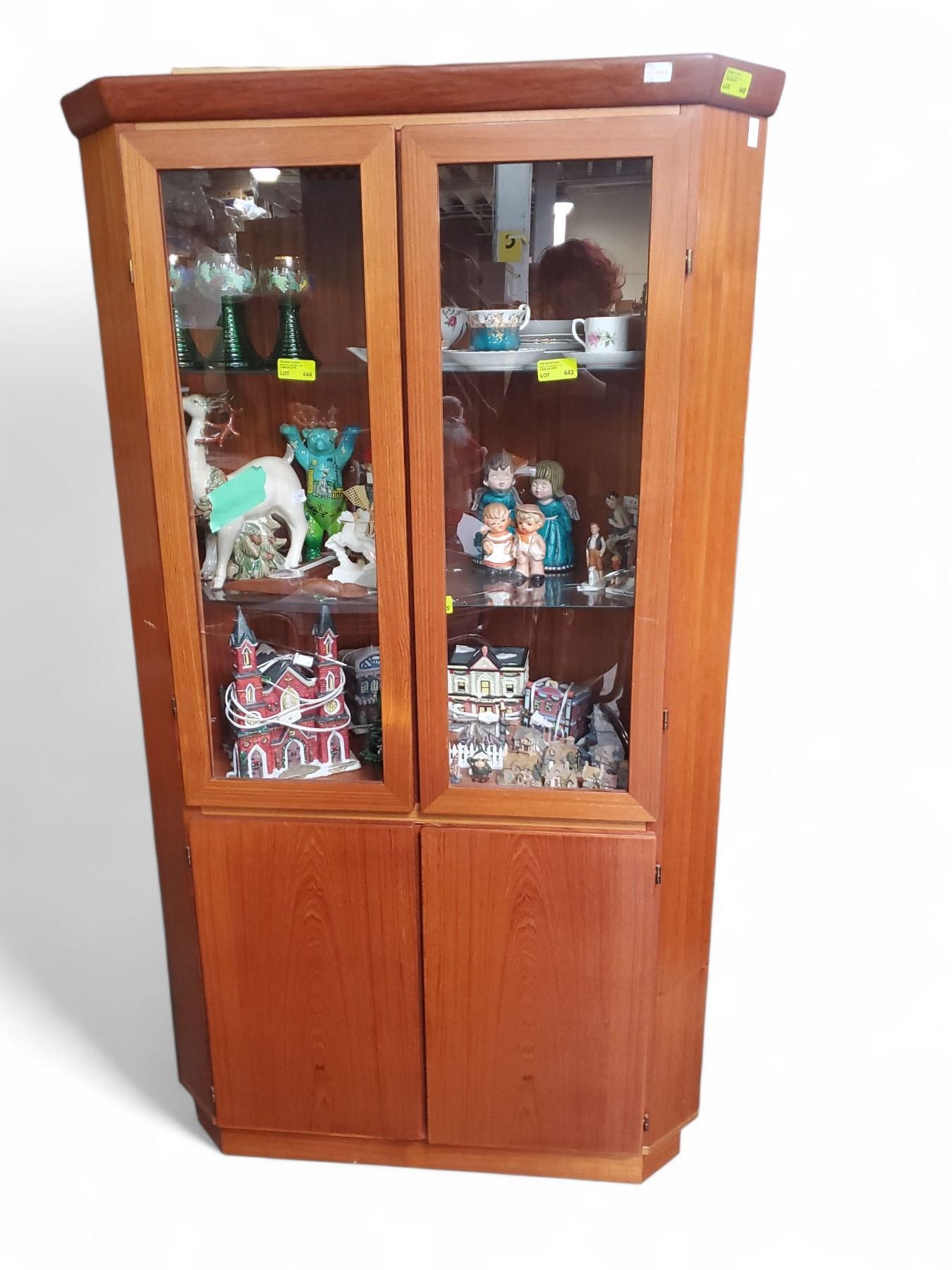 Mid-Century Teak Corner Cabinet - Contents not included - 20" deep x 30" wide x 66" tall - One glass panel is cracked.