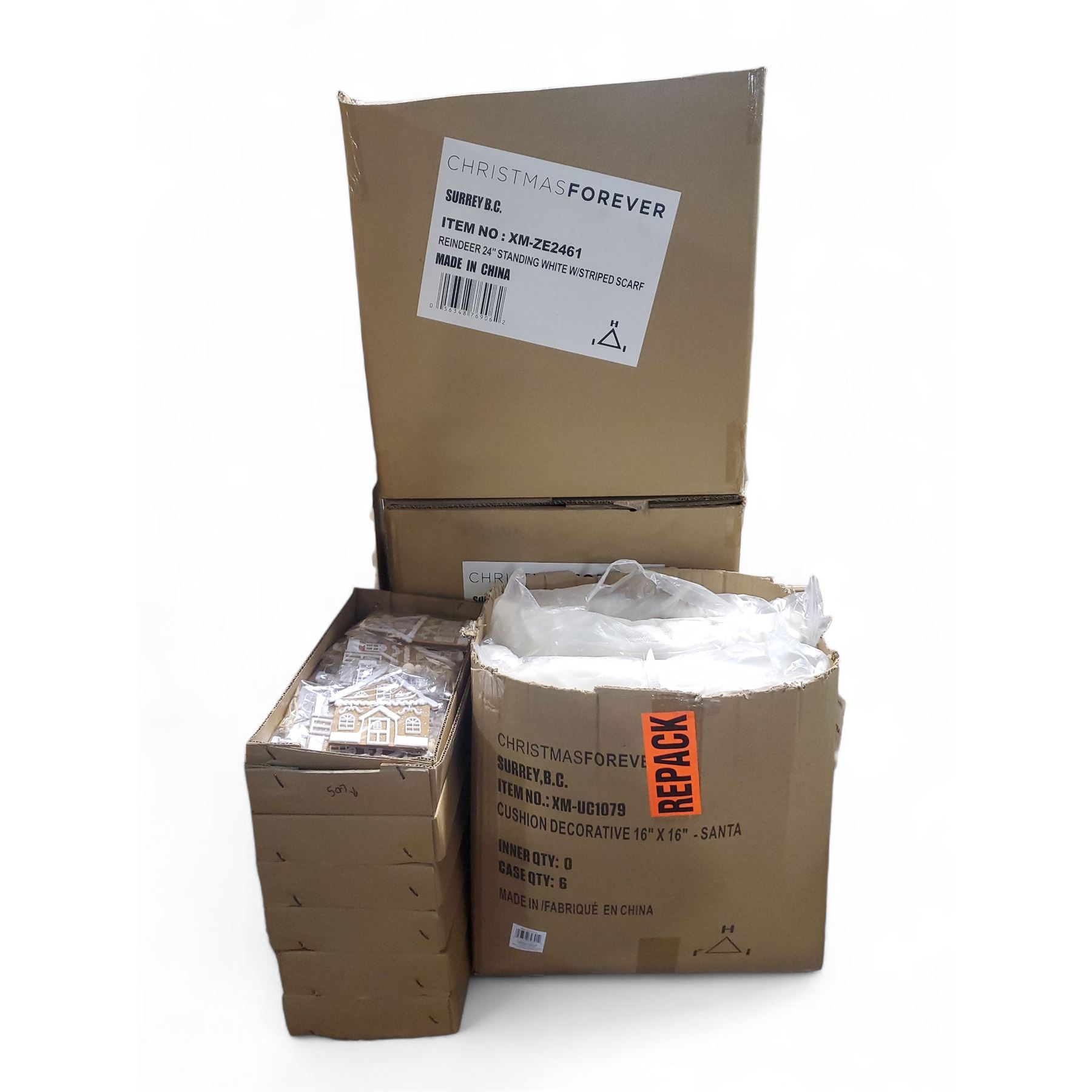 NEW Group of 9 Boxes of Christmas Decor & Cushions - includes Reindeer 24" Standing White Figurines, Ornaments & More