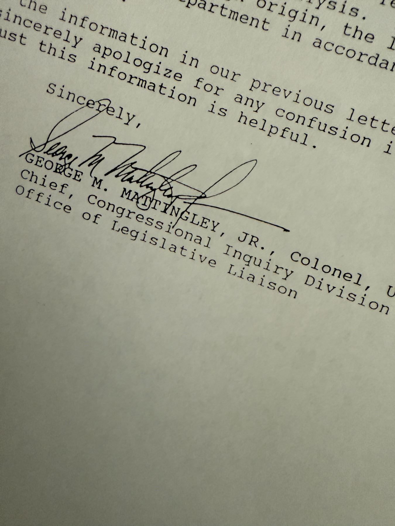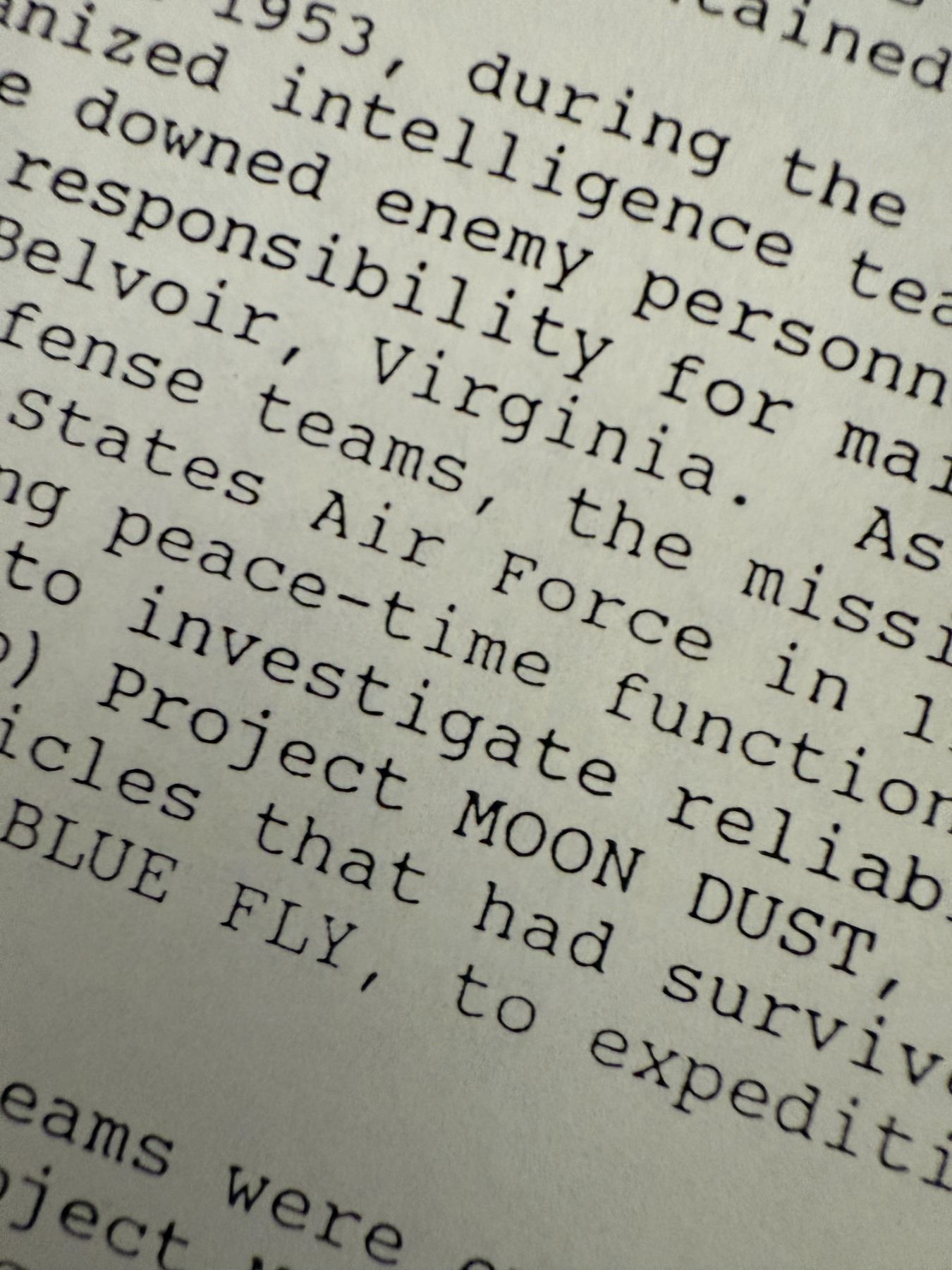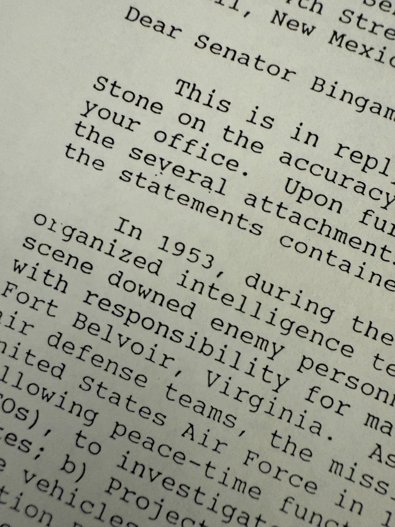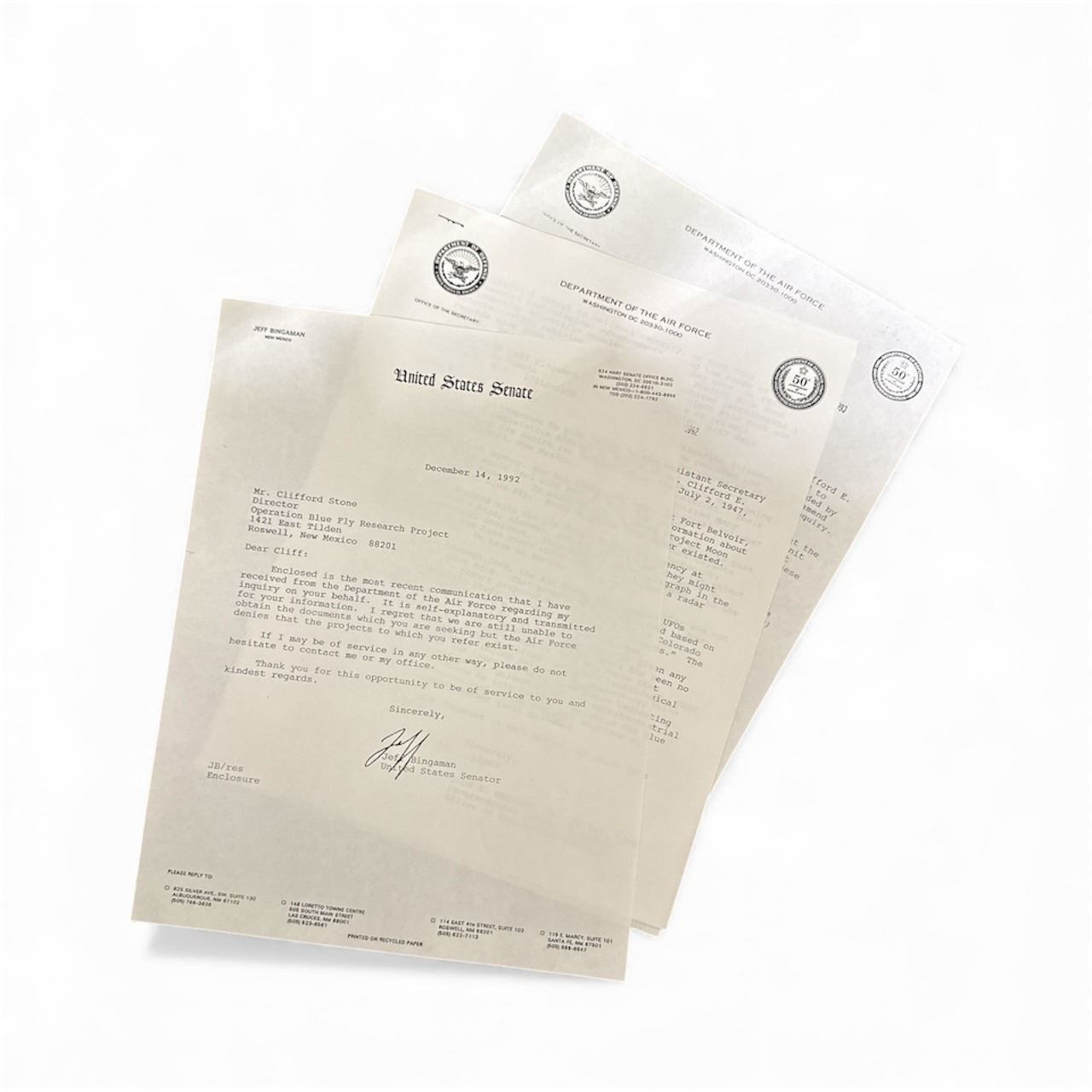 Official FOIA correspondense between Clifford Stone & New Mexico US Senator Jeff Bingaman discussing how the US Air Force investigated UFO's between 1948-1969 - Signed by John E. Madison Jr. - Lt. Col, USAF / Ammended Response in 1993 Explaining previously denied information - Project: "Moon Dust", Operation: "Blue Fly", Project: "Blue Book" and Fort Belvoir being involved in investigating UFO's during peace time, etc.