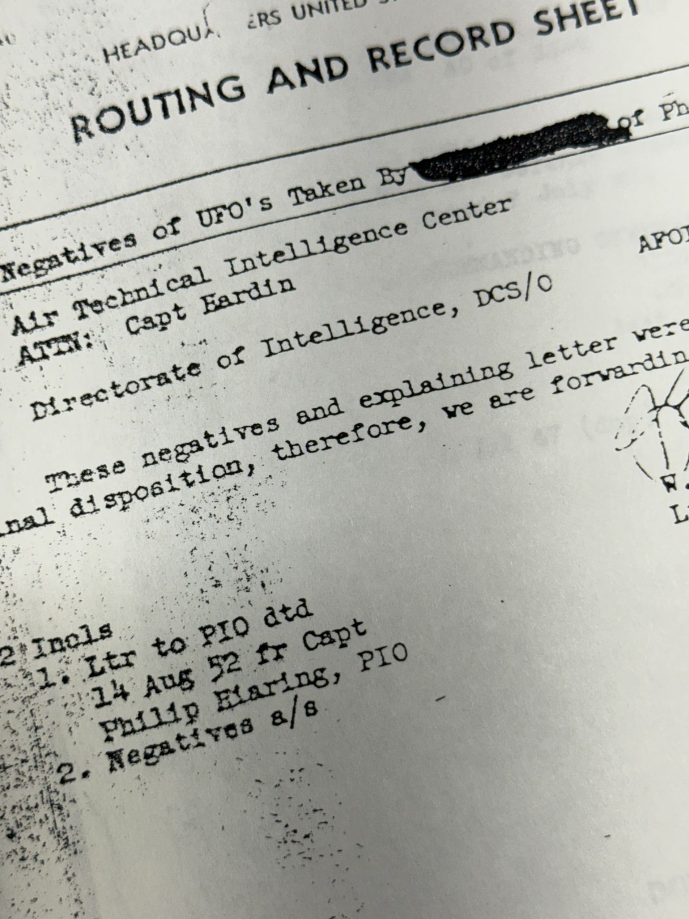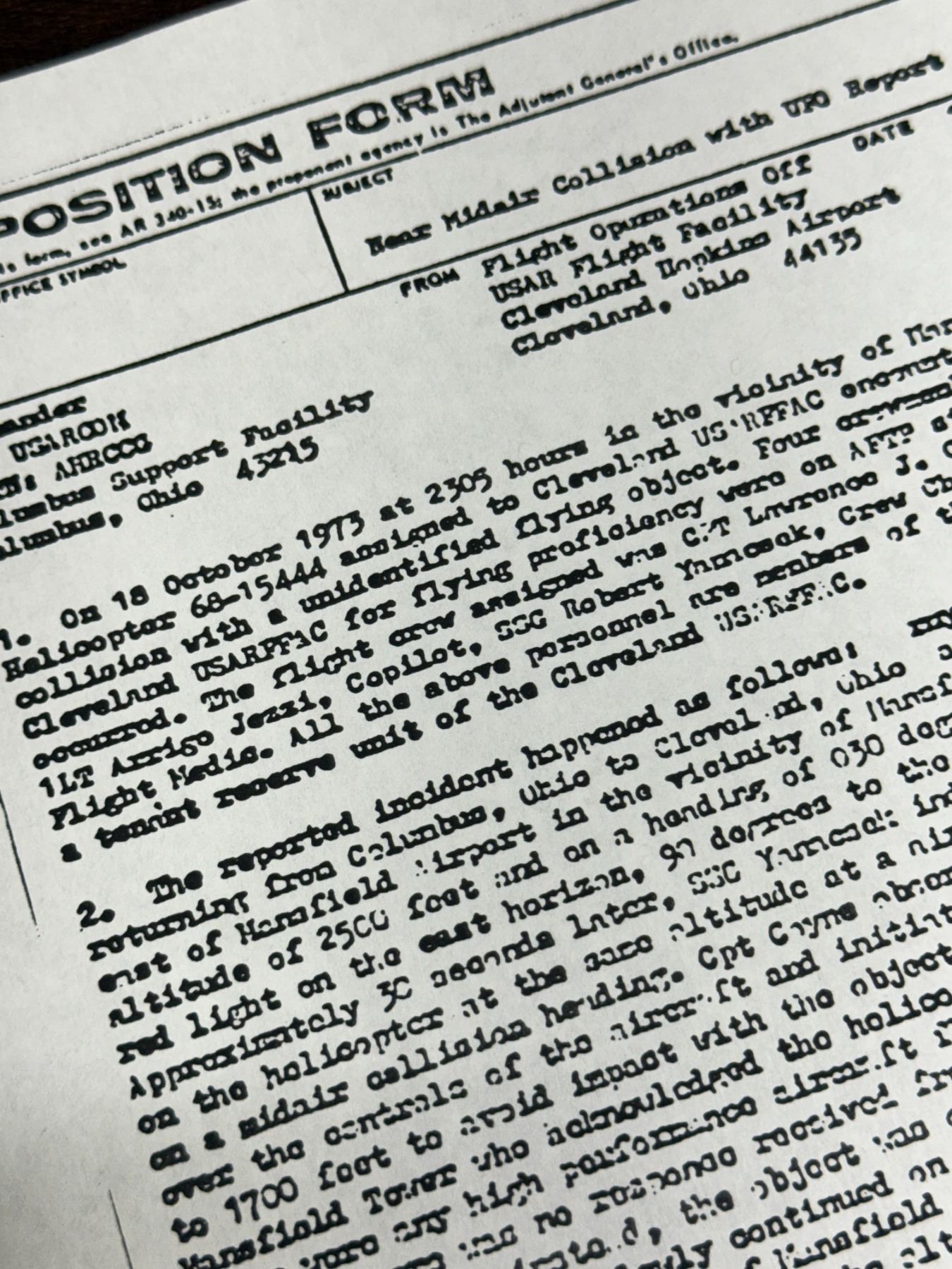 Disposition form of a pilot reporting a detailed near mid air collision with a UFO over Ohio - Document copies from Hamilton Air Force Base in Hamilton California reporting UFO's