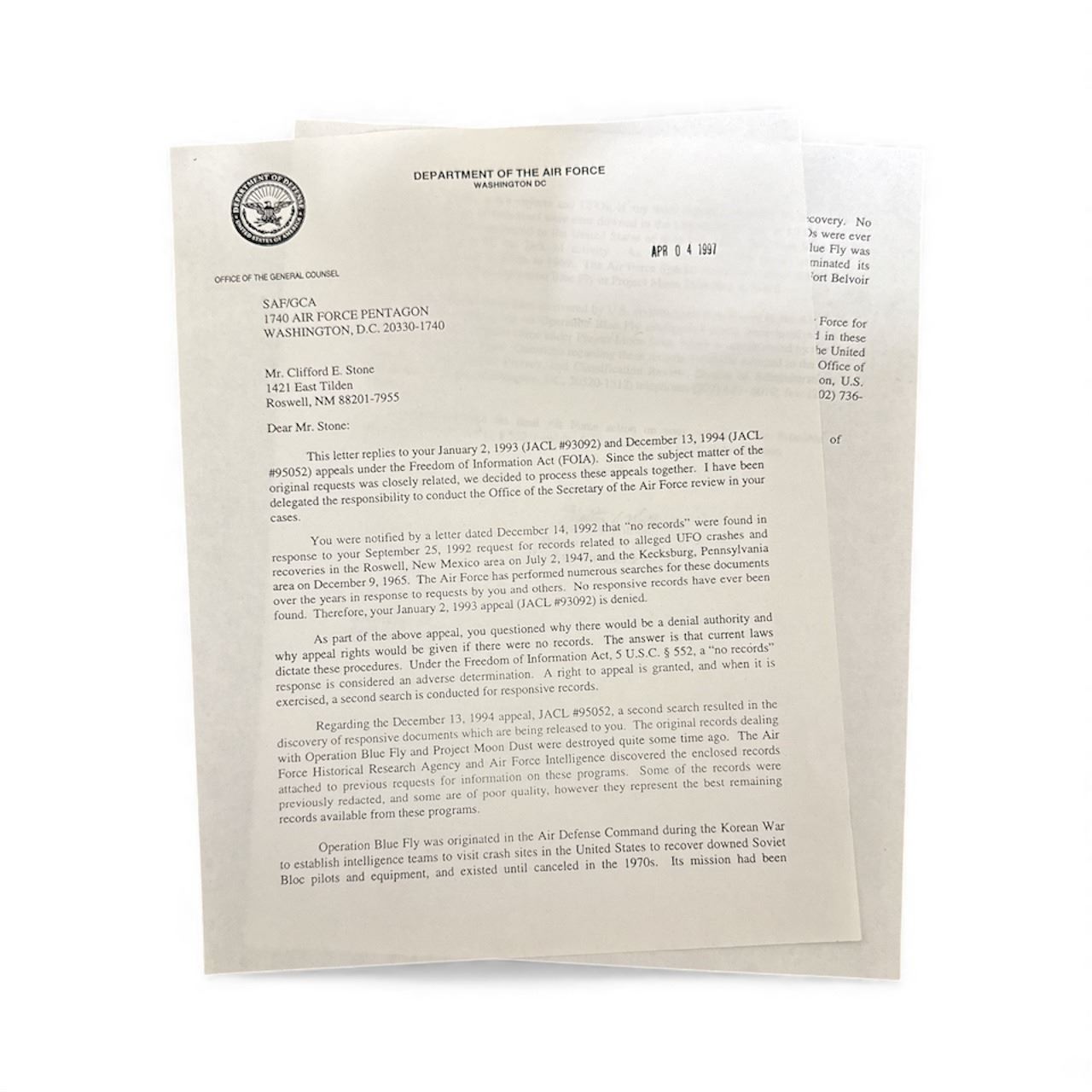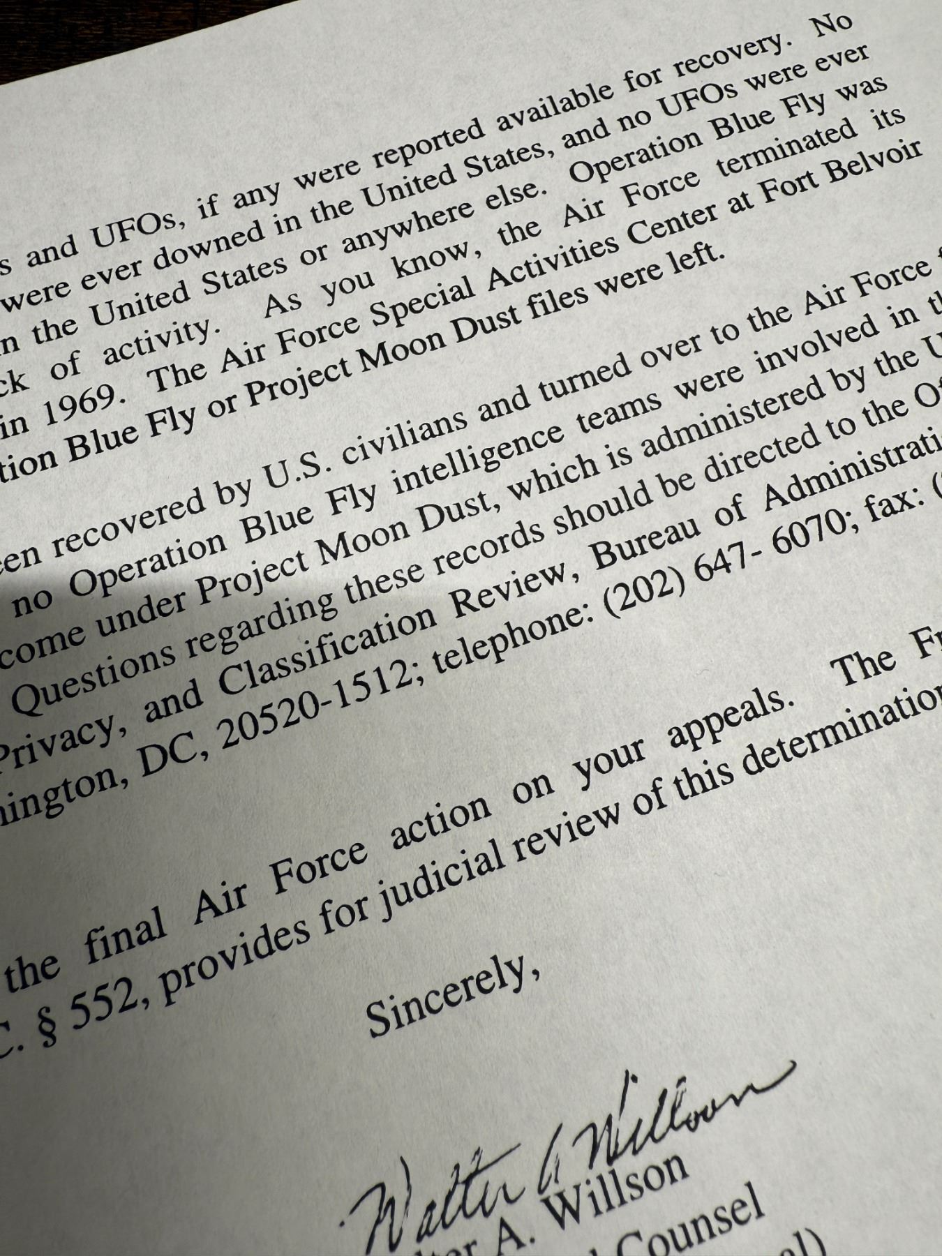 FOIA from 1997 - Discusses that the US has recovred items from space, that there were "Special Activities" being conducted at Fort Belvoir - There were no records left behind from Project: "Blue Fly" or "Moon Dust"