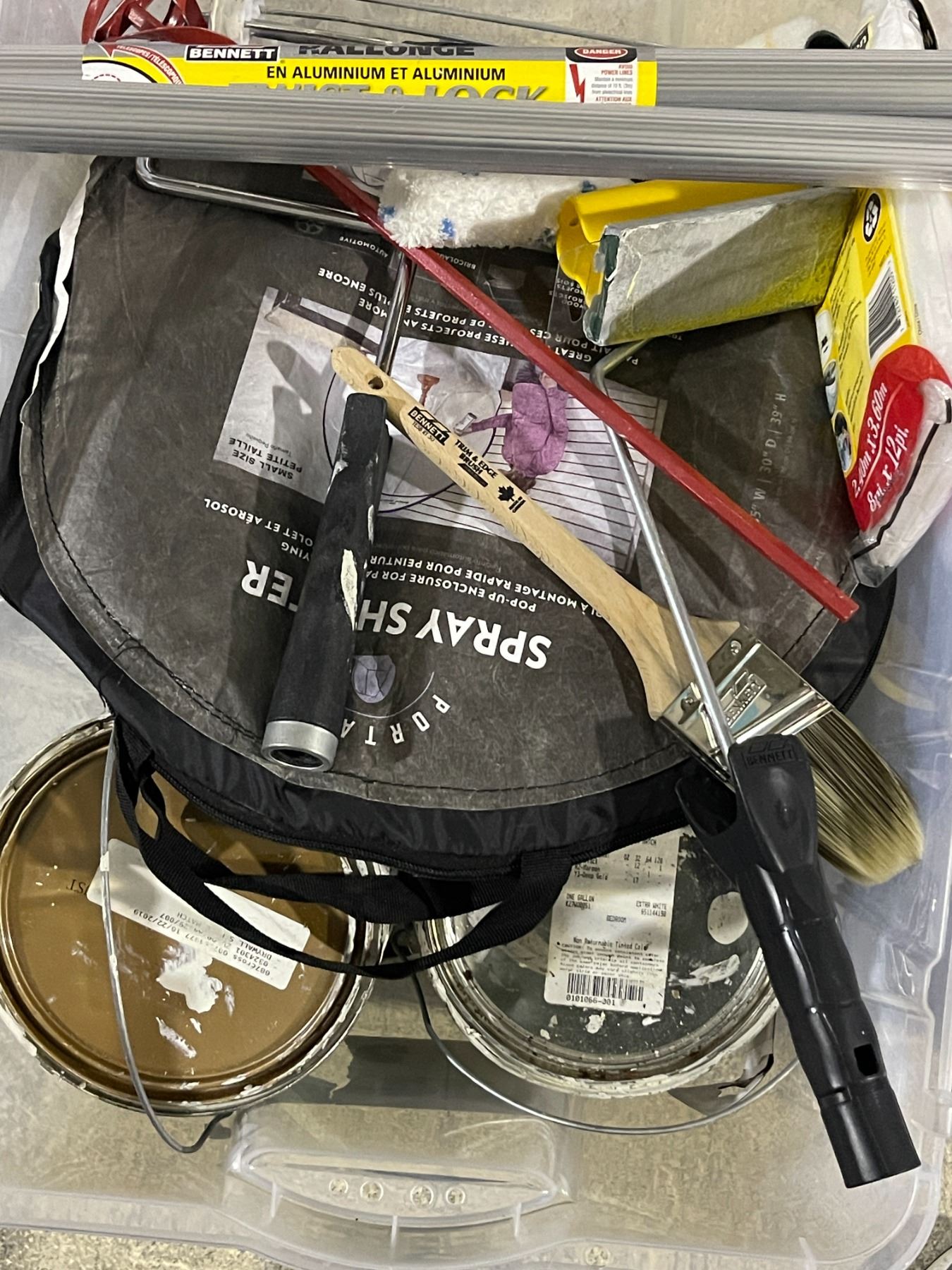 Painters lot - x2 bins of misc painting equipment - brush, rollers, paint, sanding pad, etc.