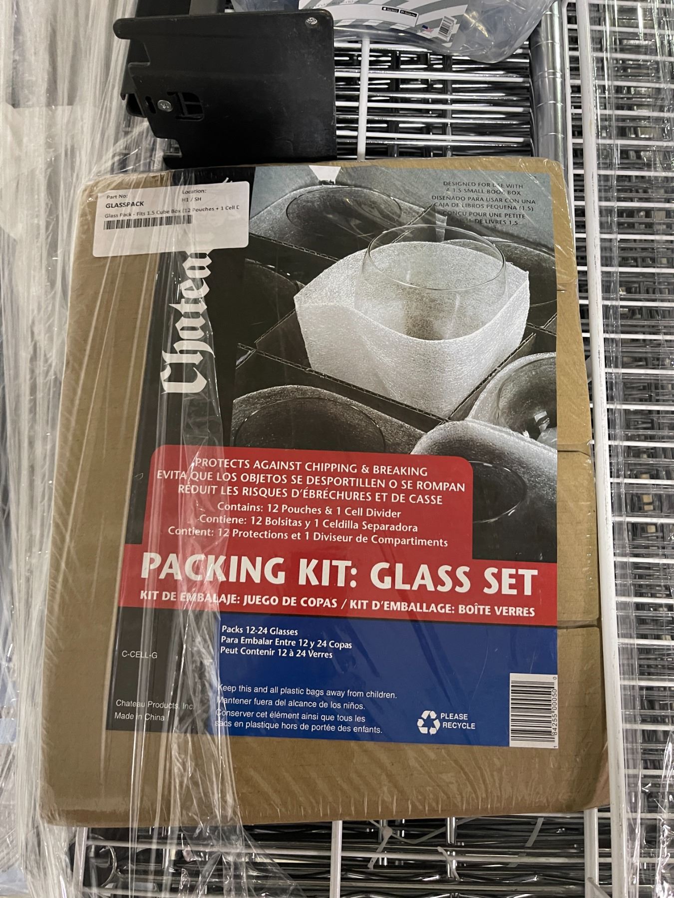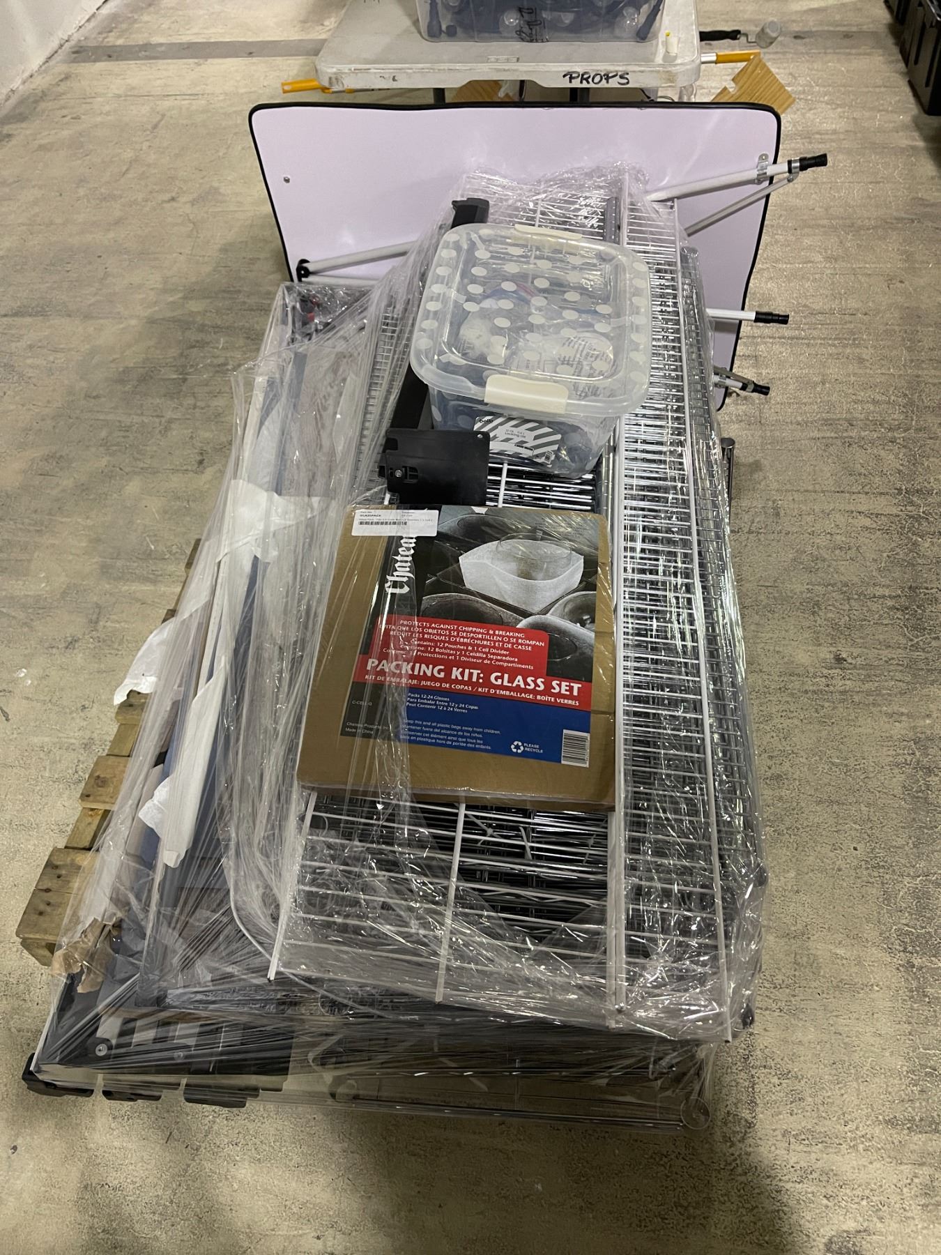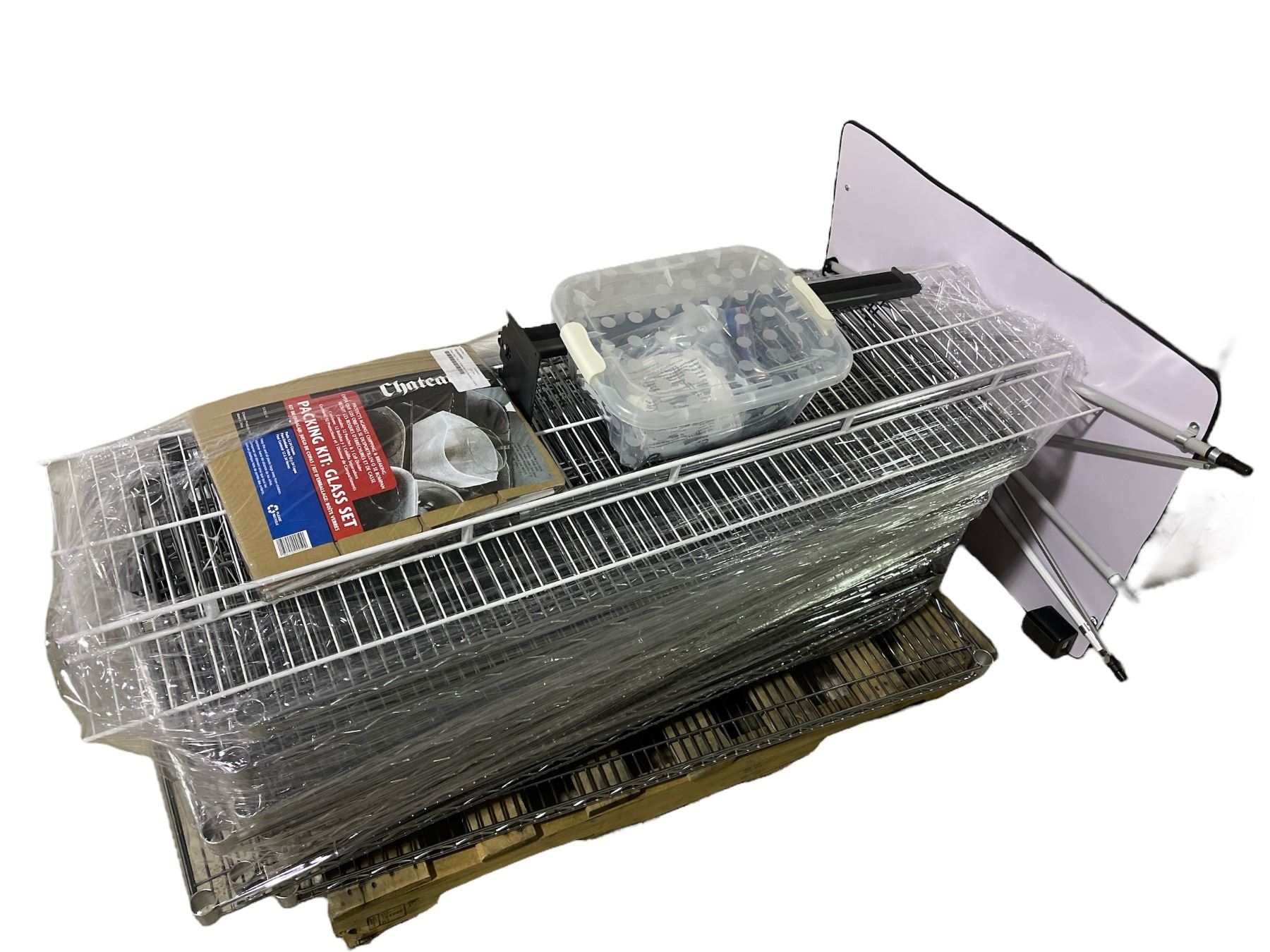 Pallet lot - Misc wire racking - glass packing kit - plastic parts for wire racking