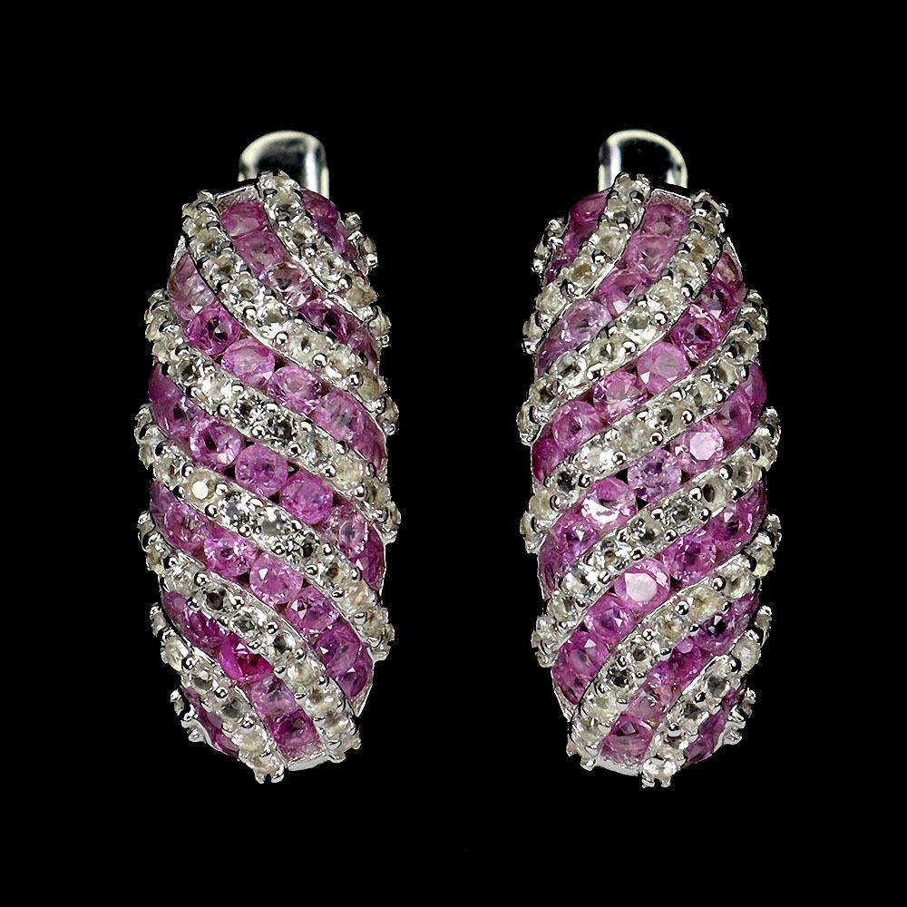 Round Diamond Cut Pink Sapphire and White Topaz Earrings in 14k White Gold-Plated 925 Sterling Silver Appraised Replacement Value CAD 2,900