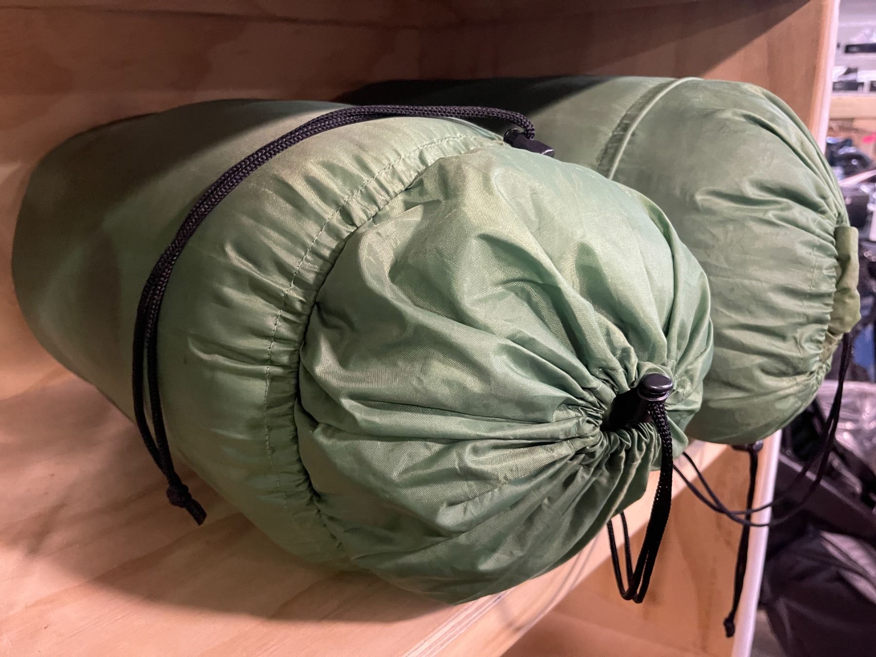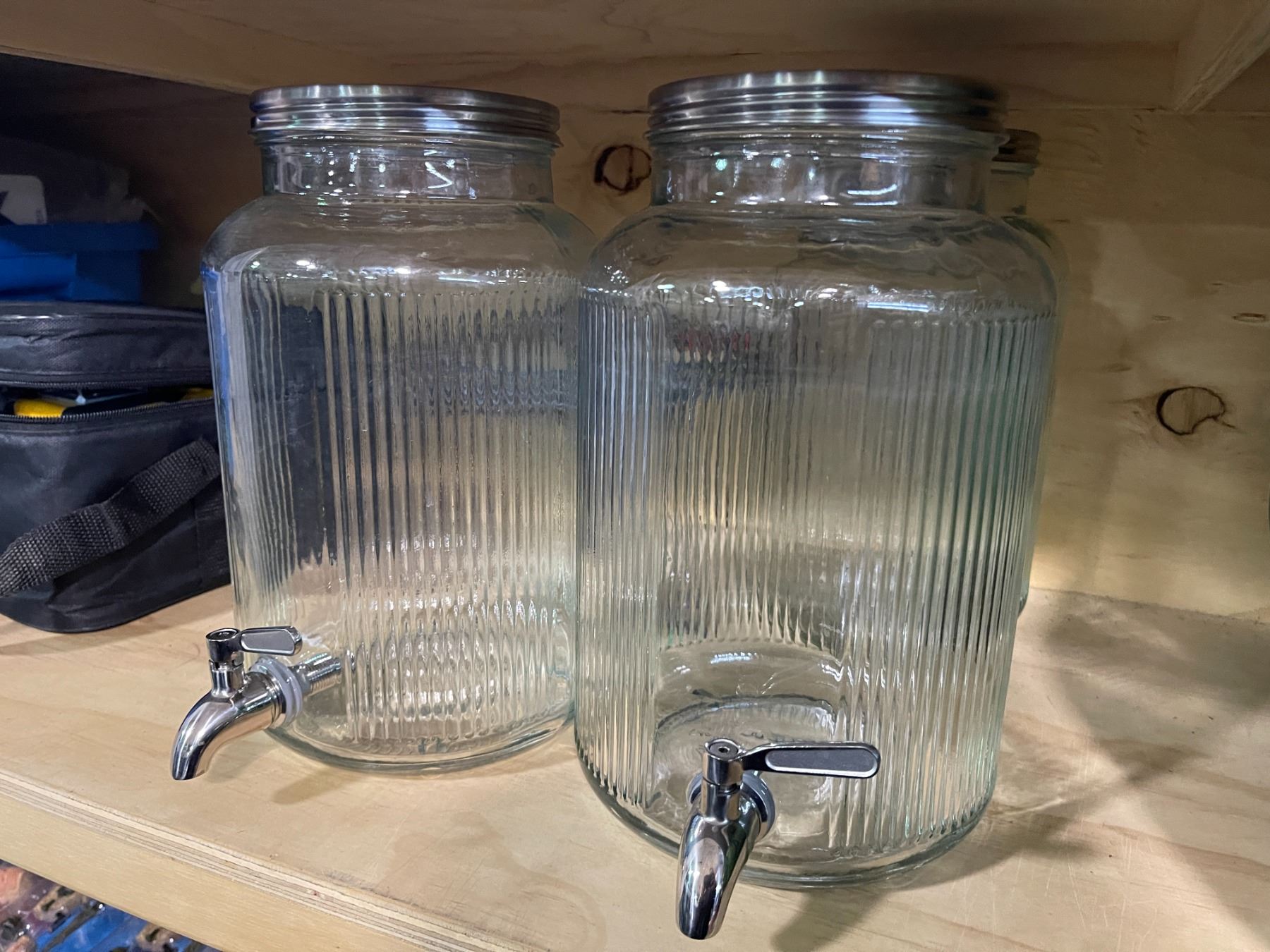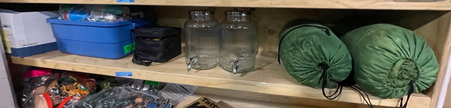 Shelf Lot of Movie Set Dec Items - includes 2 Green Sleeping Bags/ Glass Beverage Dispensers, Misc. Decoration & More