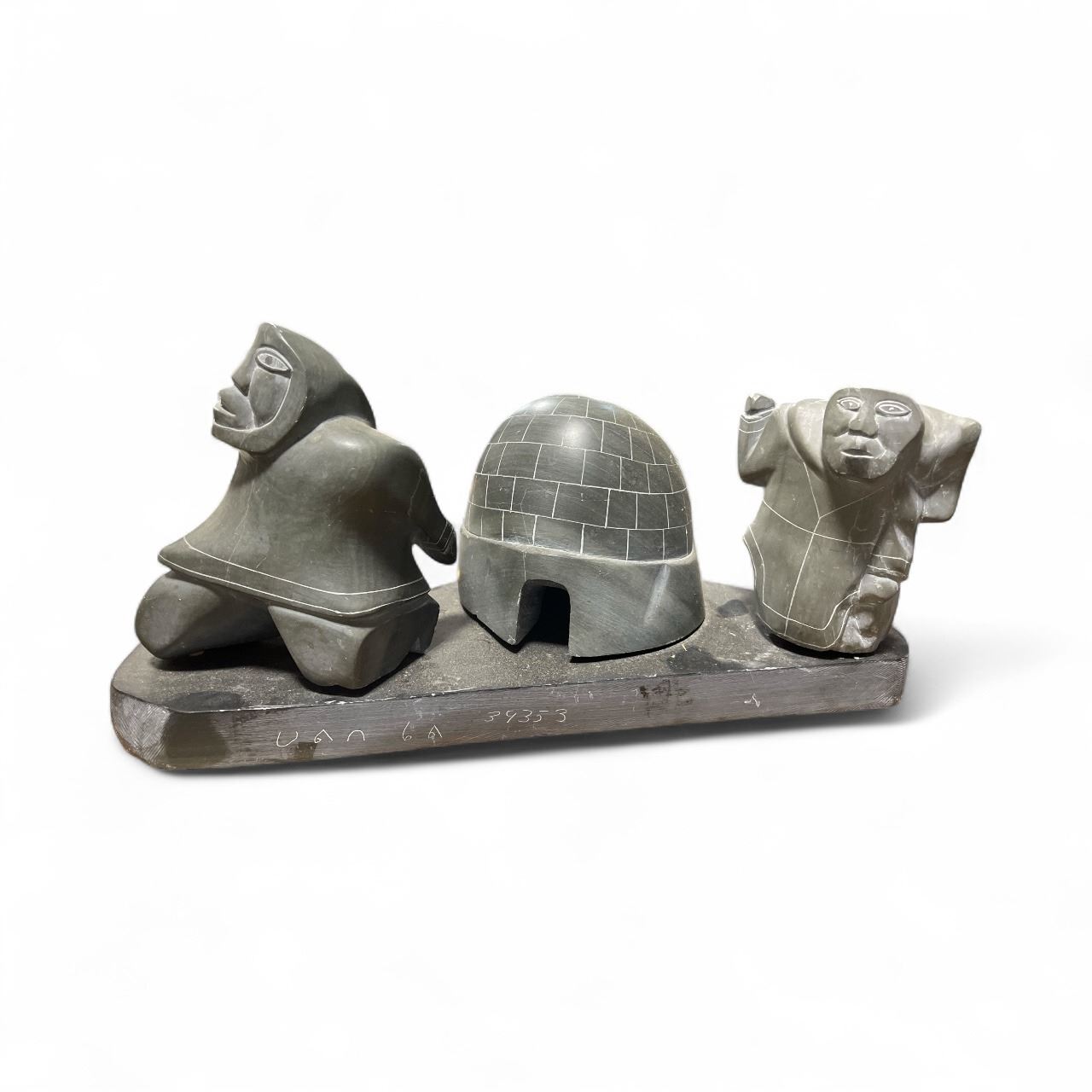 Signed Inuit Soapstone Carving of a Igloo and Two People - 5" x 14" x 7" tall