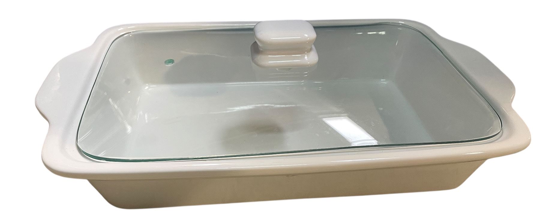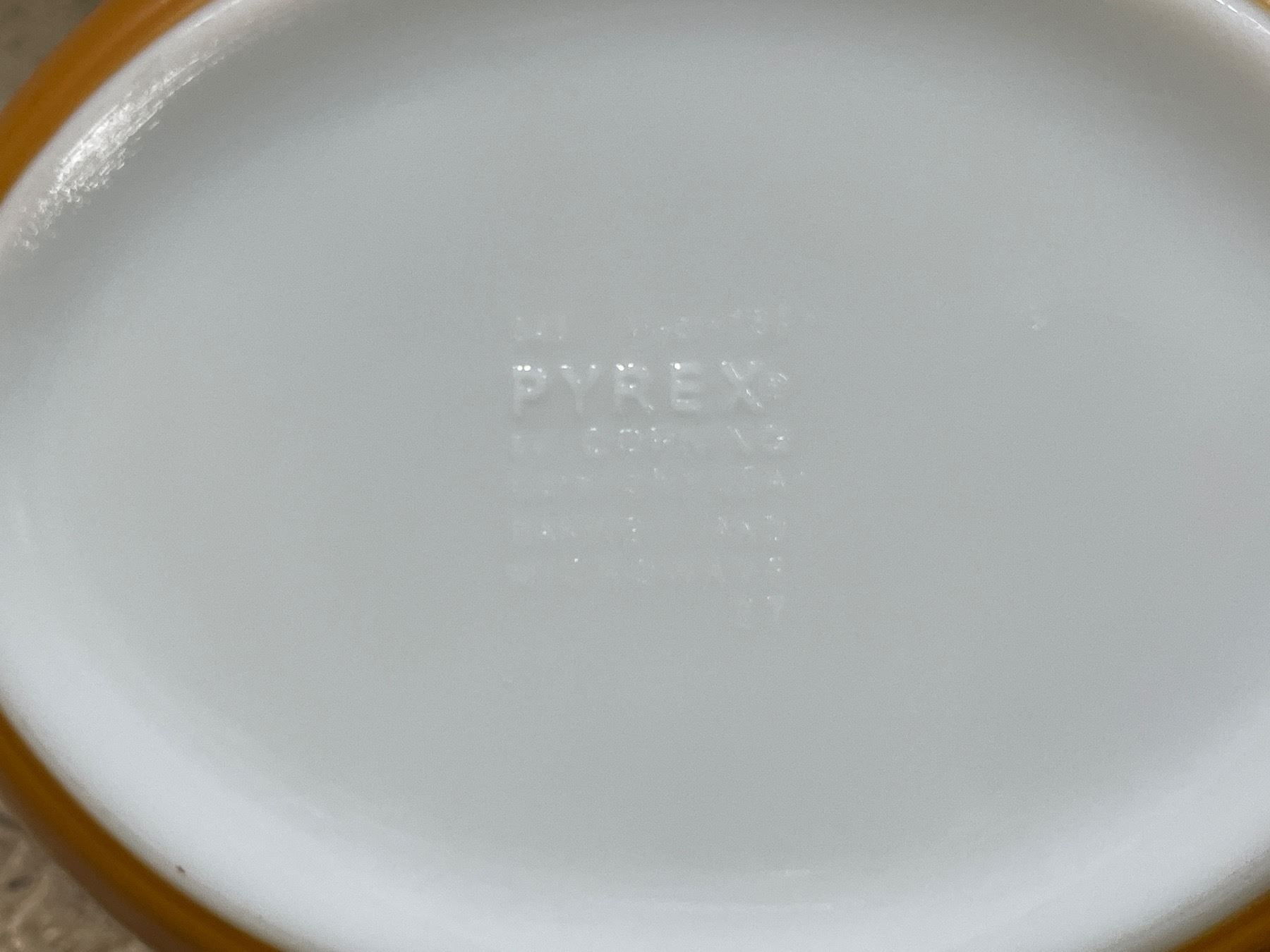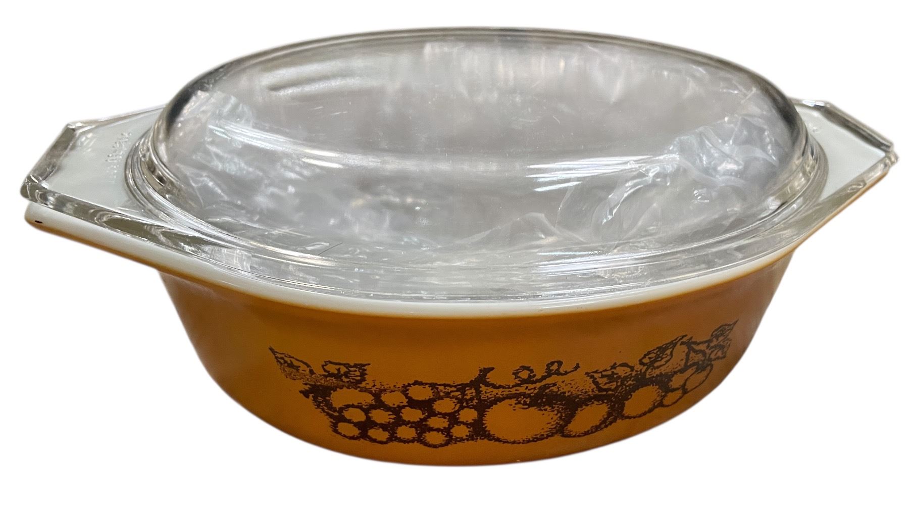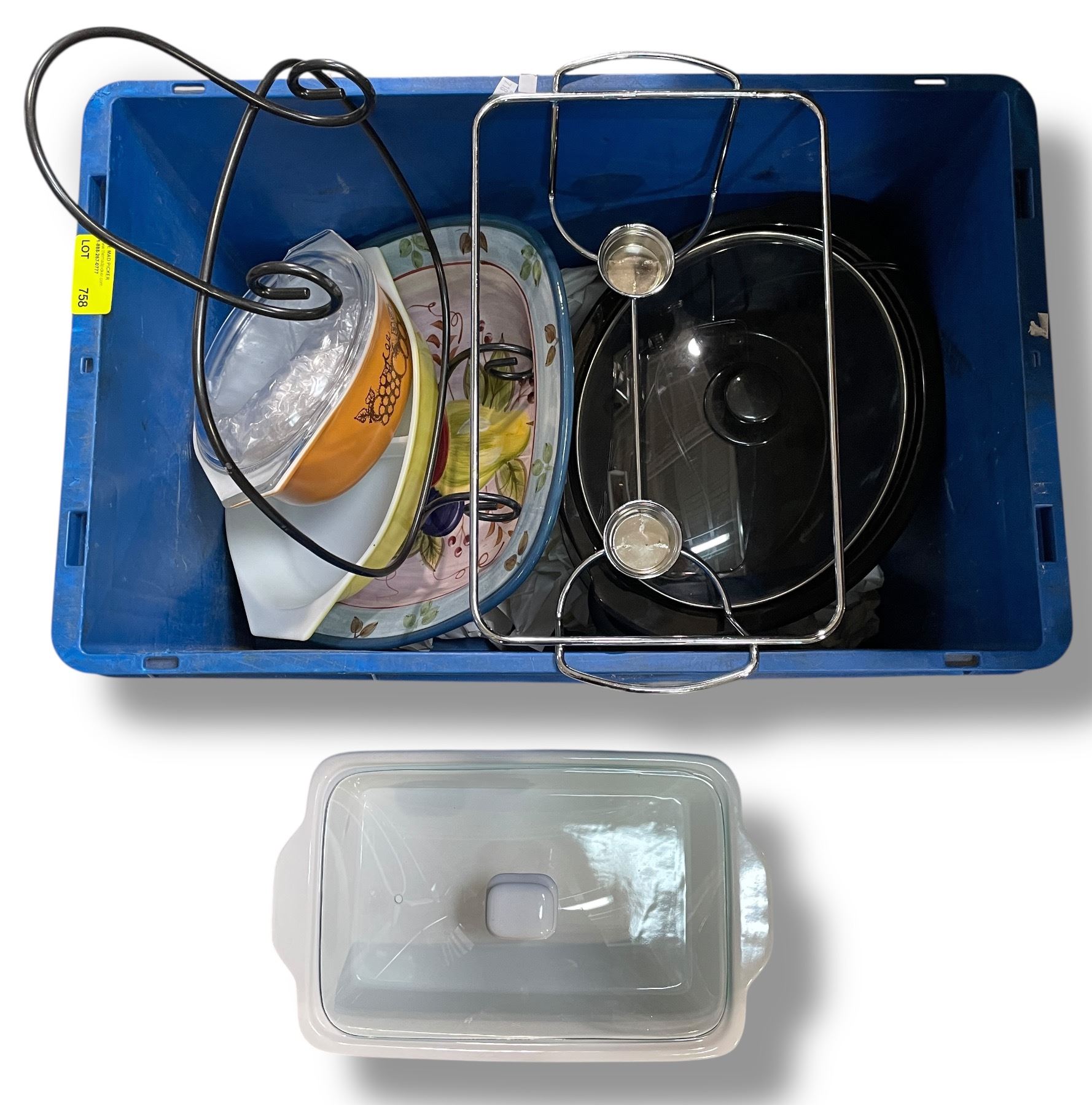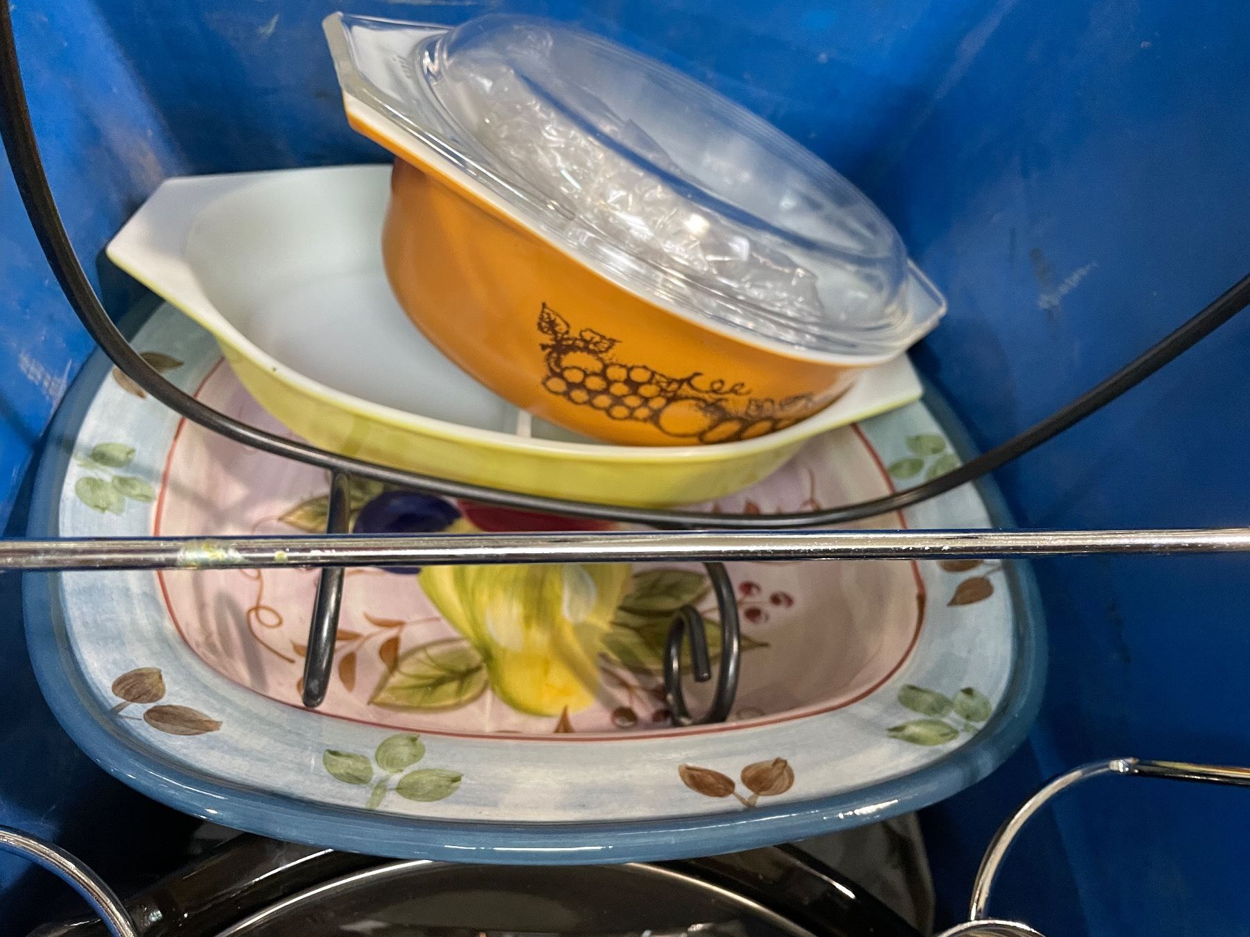 Tote of Kitchen Ware & 2 Vintage Pyrex Dishes