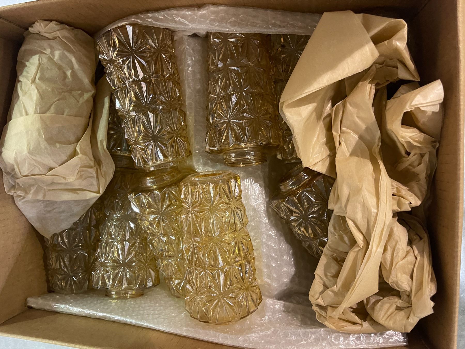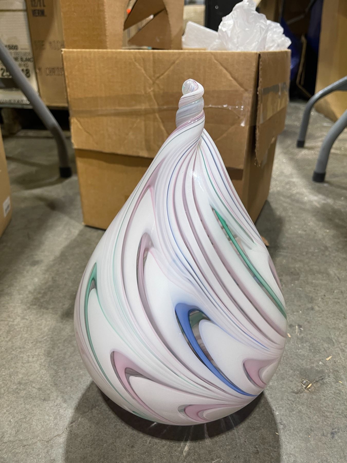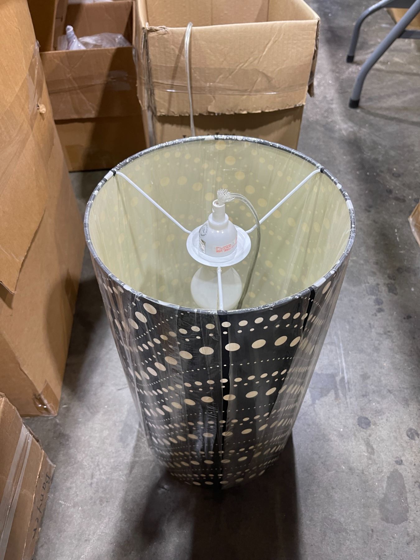 Under table lot - x4 boxes containing various size and designed vintage glass for light fixtures + x1 bin of glass pendants for chandeliers