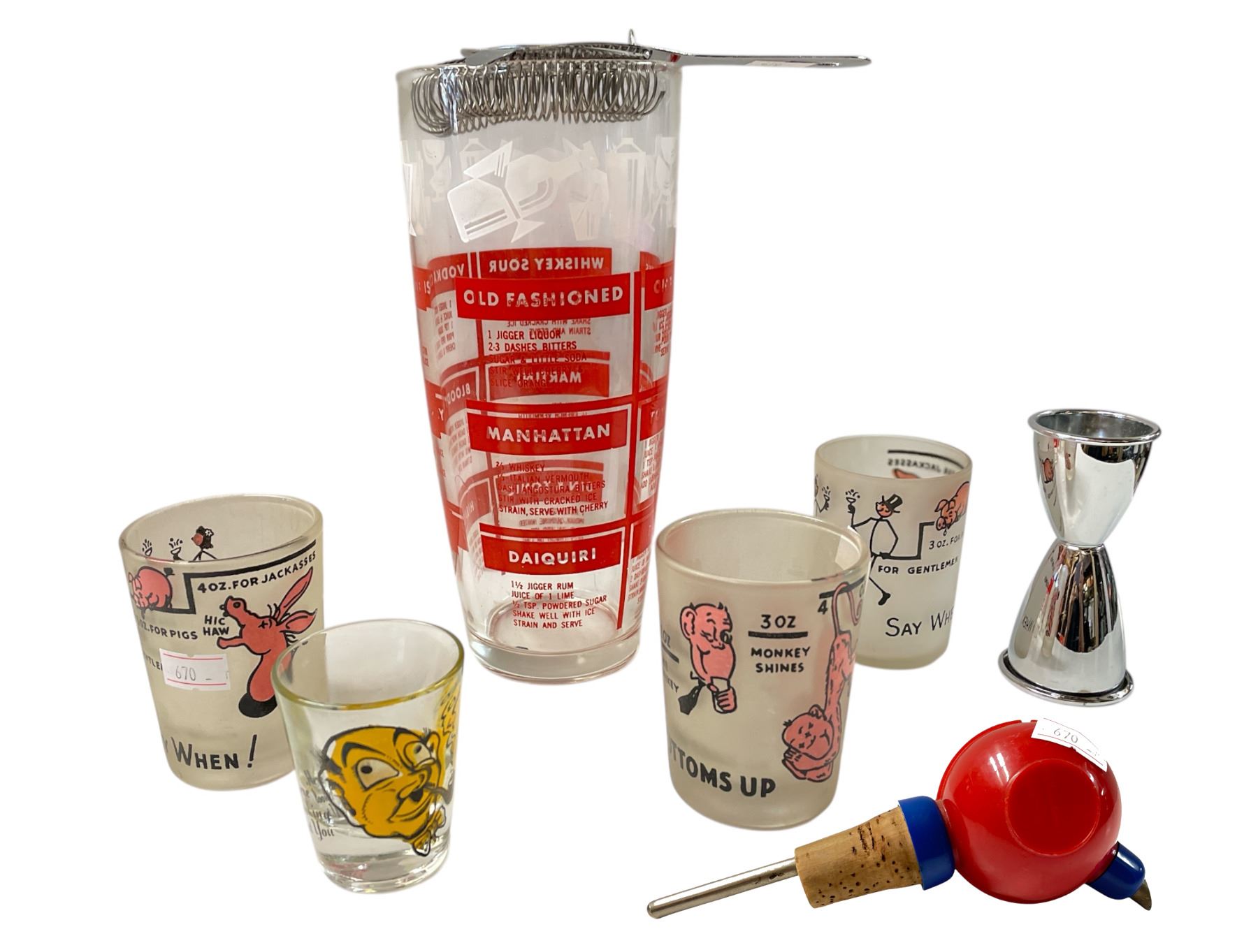 Vintage Cocktail Shaker With Glasses & Liquor Pourer