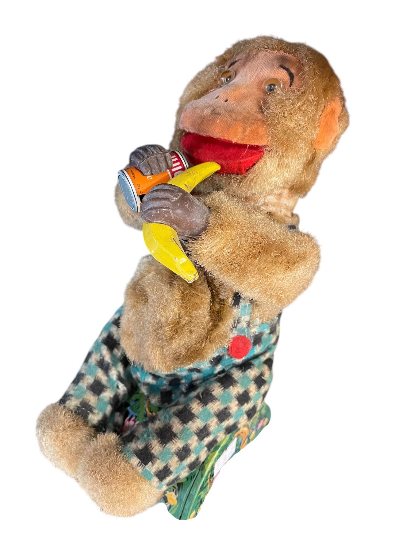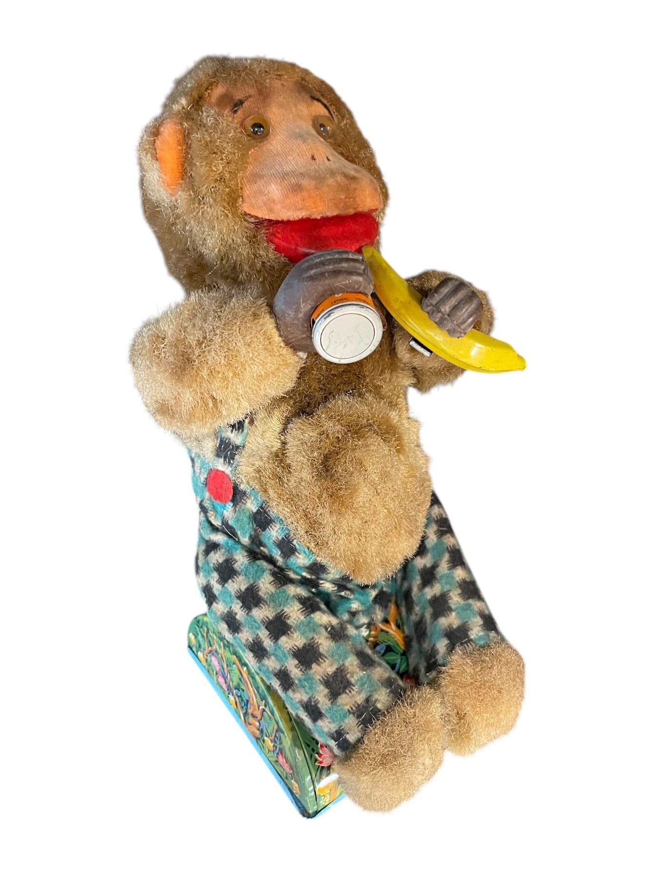 Vintage Tin Litho Battery Operated Drinking Banana Eating Monkey